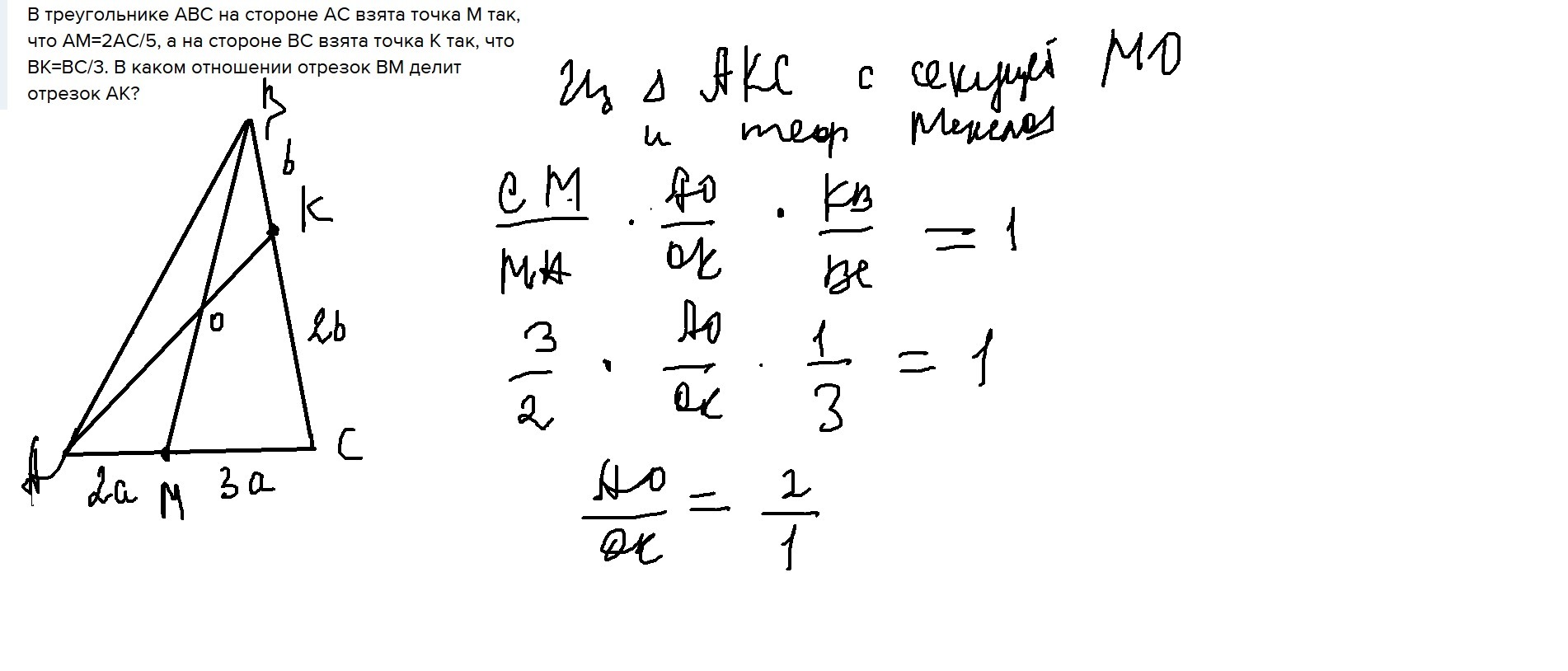 В треугольнике ABC на стороне AC взята точка M так, что AM=2AC/5, а на стороне BC взята точка K так, что BK=BC/3. В каком отношении отрезок BM делит отрезок AK?