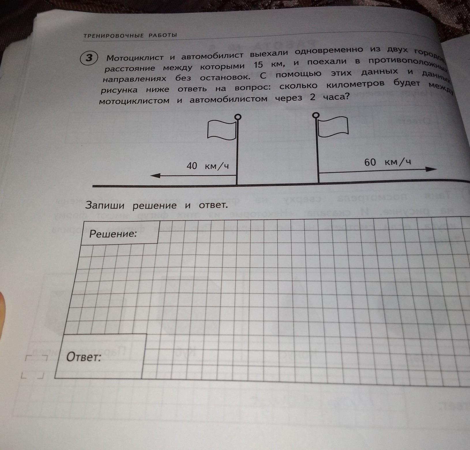 Мотоциклист и автомобилист выехали одновременно из двух городов,расстояние между которыми 15 км,и поехали в противоположных направлениях без остановок.С помощью этих данных и данных рисунка ниже ответь на вопрос:сколько километров будет между мотоциклистом и автомобилистом через 2 часа?