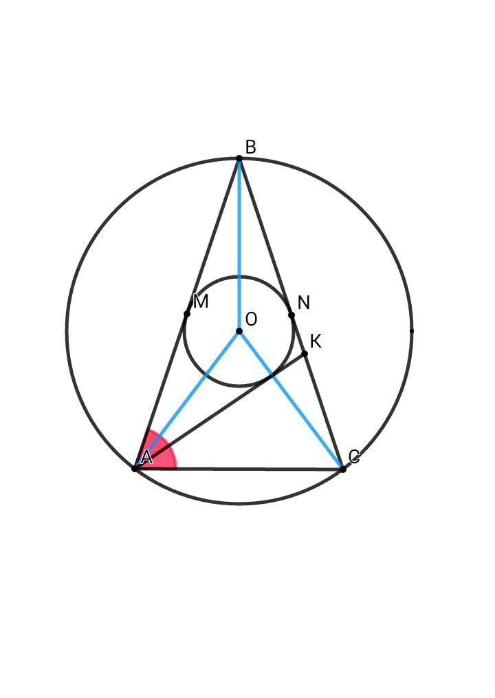 В треугольнике АВС проведены биссектрисы А К. Центр окружности, вписанного в треугольник АК В, совпадает с центром окружности, описанной около треугольника АВС. Найдите углы треугольника АВС. ДАЮ МНОГО БАЛЛОВ!!!!!!!