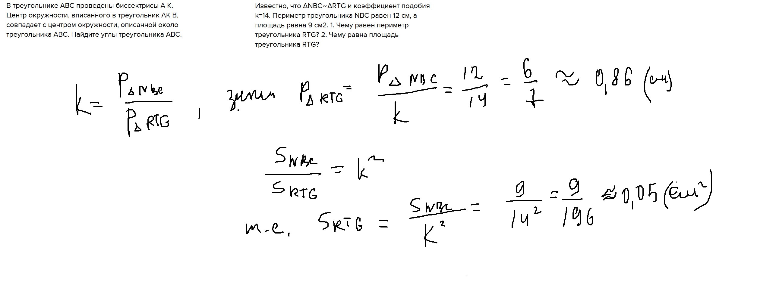 Известно, что ΔNBC∼ΔRTG и коэффициент подобия k=14. Периметр треугольника NBC равен 12 см, а площадь равна 9 см2. 1. Чему равен периметр треугольника RTG? 2. Чему равна площадь треугольника RTG?