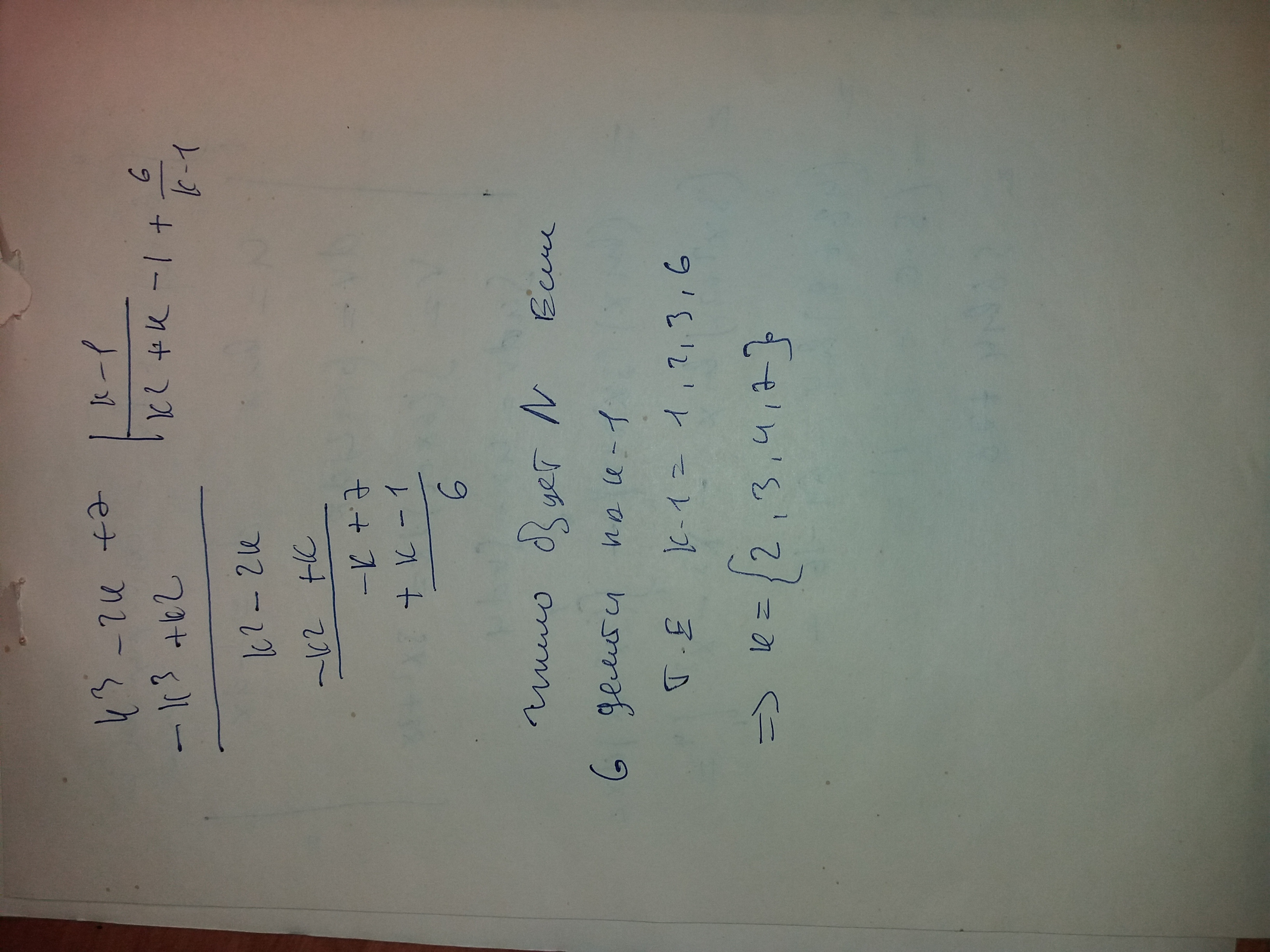 При каких целых значениях k число (k^3-2k+7)/(k-1) является натуральным ?