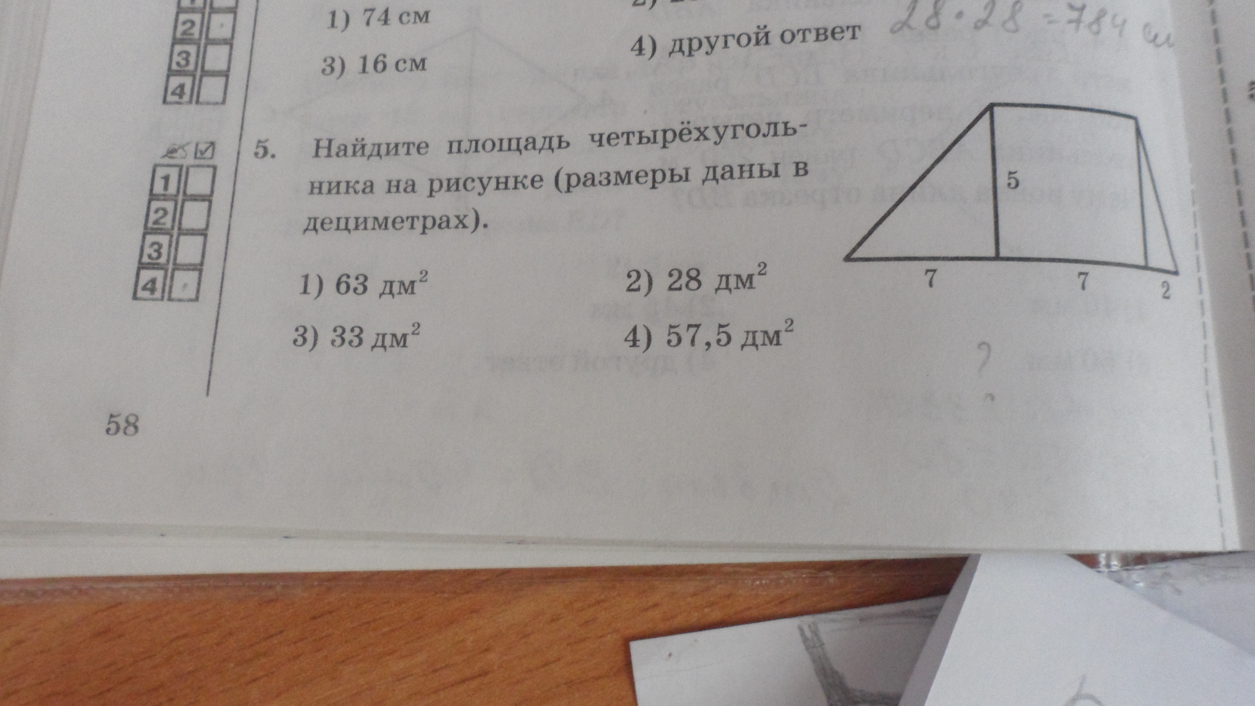 S = 5×7+(5×2):2+(7×5):2=57,5дм в кв. - 4