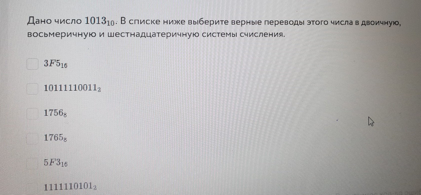 1013(10) , для перевода в двоичную систему нужно делить число на 2 , и запоминать остатки от деления, таким образом 1013(10) =