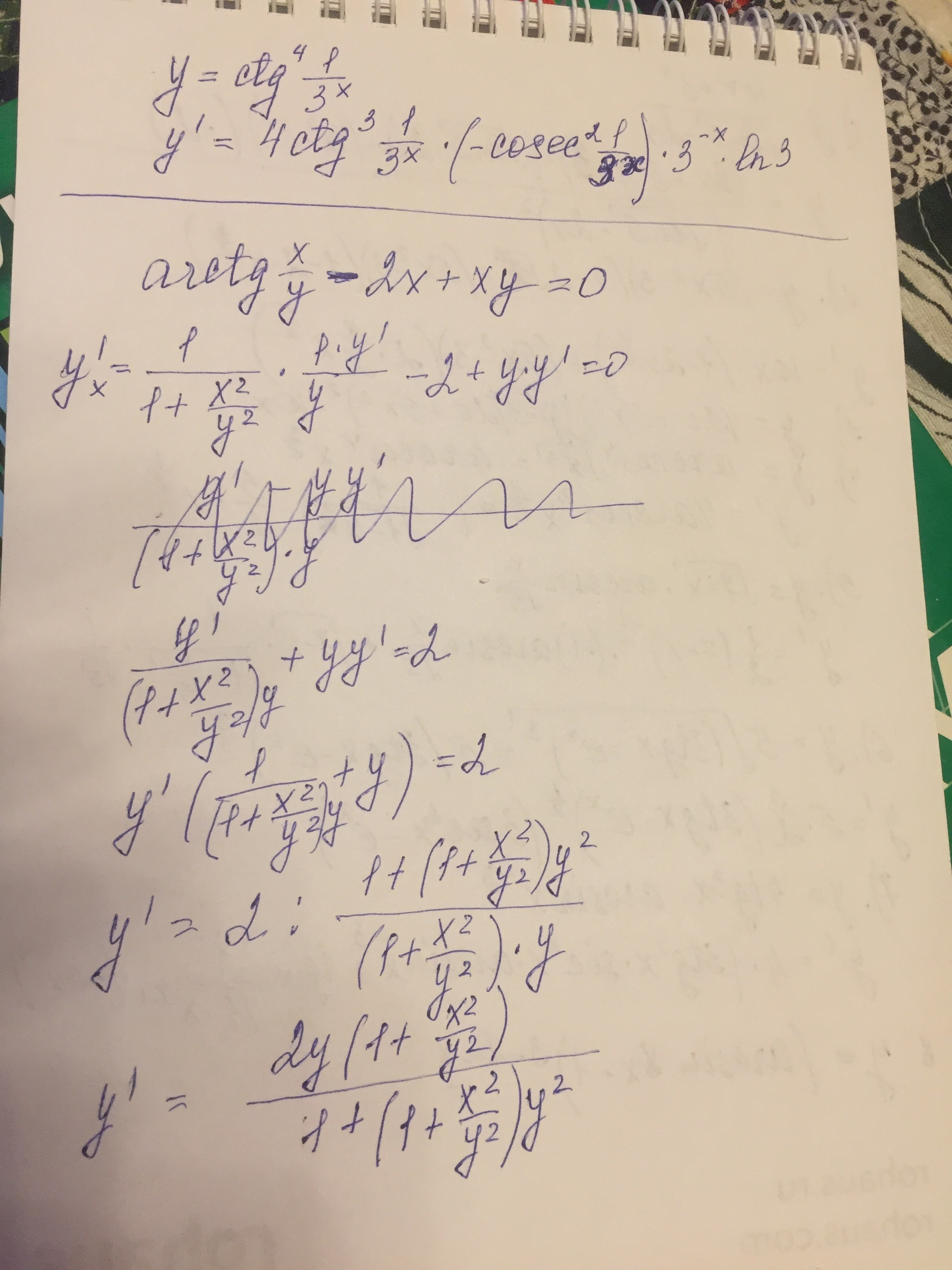 при нахождении производной arctg x/y у меня получилось y/(x^2+y^2), а производная 2x+xy=2+у+ху