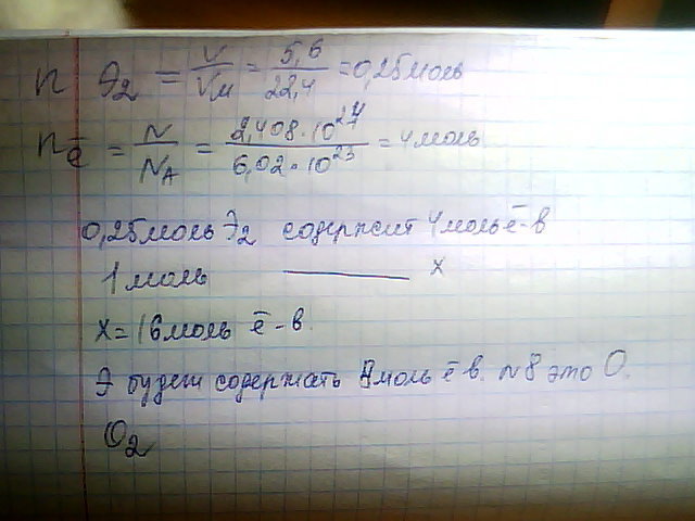 Смотрите на решение задачи: нашли количество газа 5,6/22,4=0,25 моль, далее нашли количество электронов 3,612*10^24/6.02*10^23=6 моль, далее находим сколько электронов в 1 моль вещества ( пропоция х=6*1/0,25=24 моль электронов, далее раз это газ, то молекула будет состоять из трех атомов, значит в одном атоме будет 24/3=8 электронов , протонов тоже 8, порядковый номер 8. Это кислород, формула О3-озон, молярная масса 16*3=48 г/моль