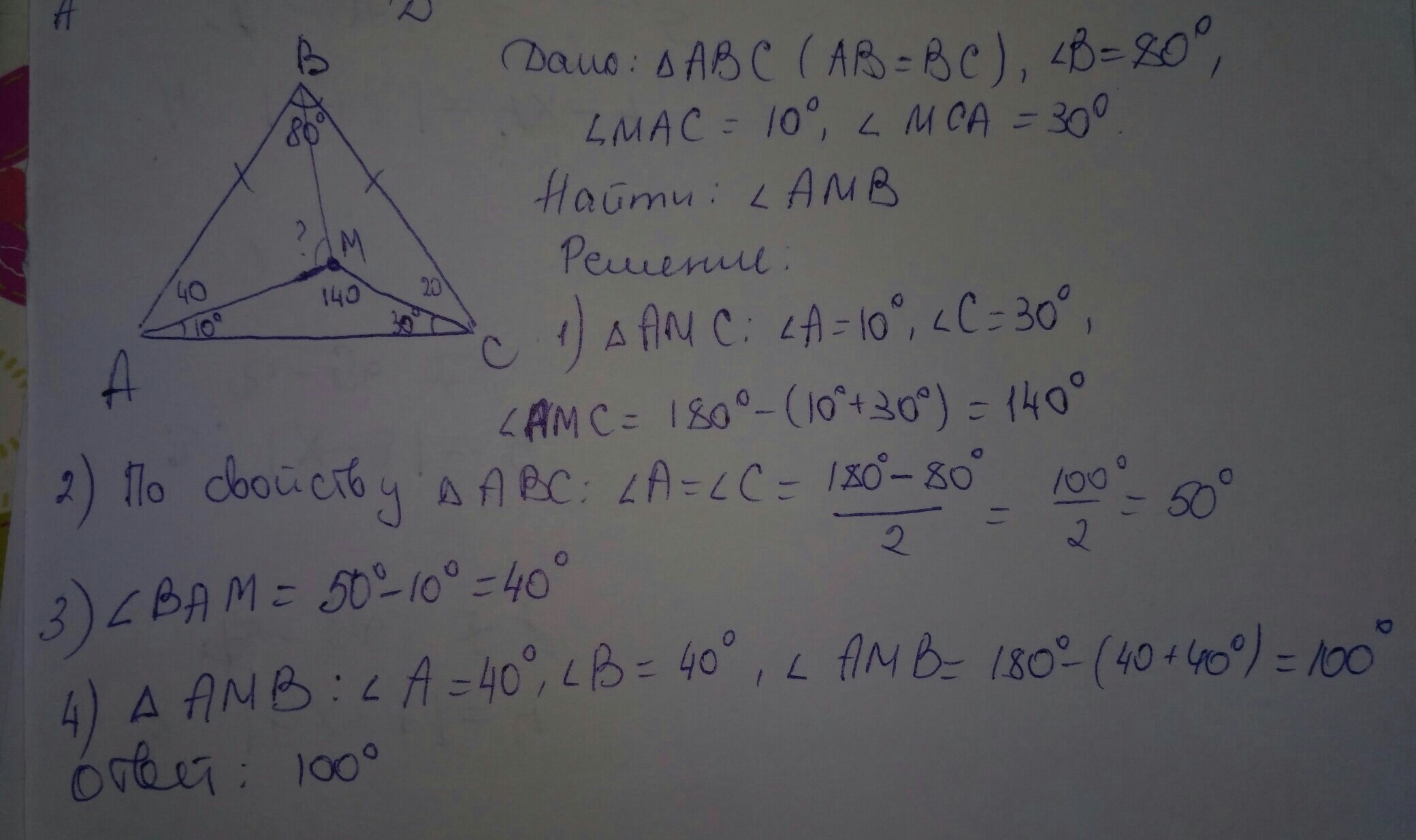 А можно подробнее с того места, где угол В (тот который АВМ) становится равен 40 градусам? В условиях не сказано, что АМ равно ВМ. А то в моих расчетах получается 70 и угол АМВ тоже получается 70 градусов