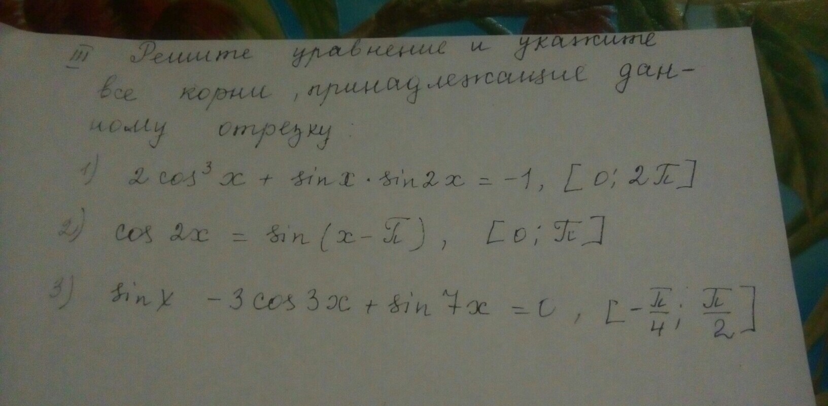 помогите пожалуйста решить уравнения и укажите все корни , принадлежащие данному отрезку , примеры в фото