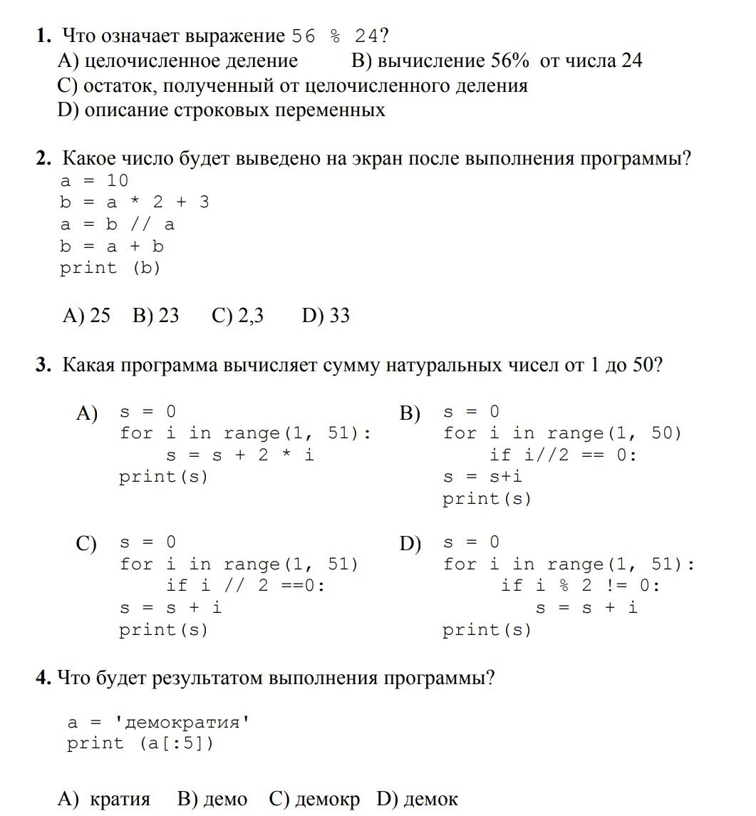 Сразу отбросим программы (B) и (C), поскольку имеют неверный синтаксис программы (после range(.. , ..) должно быть двоеточие). В программе (A) в переменную s записывается сумма УДВОЕННЫХ (2*i) чисел - нам это не подходит. В программе D число проверяется на НЕЧЁТНОСТЬ (i % 2 != 0) - оно нам не подходит. Здесь вообще нет программы, вычисляющей конкретно сумму всех чисел от 1 до 50. Здесь вычисляется либо чётность/нечётность, либо удвоенное произведение.