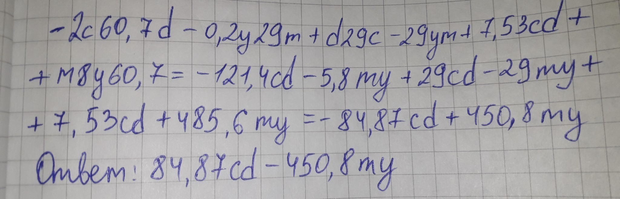 Приведи многочлен к стандартному виду. В ответе запиши многочлен противоположный полученному. −2c60,7d−0,2y29m+d29c−29ym+7,53cd+m8y60,7 заранее спасибо