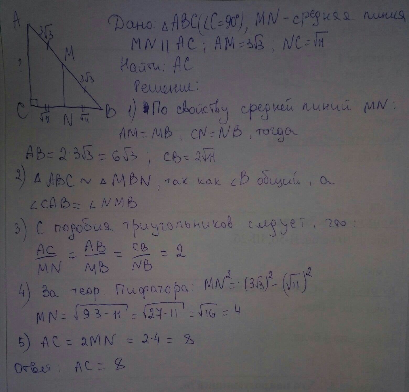 в прямоугольном треугольнике abc с прямым углом c проведена средняя линия mn параллельная катету ac найдите длину ac если am=3 корня из 3 nc=корень из 11