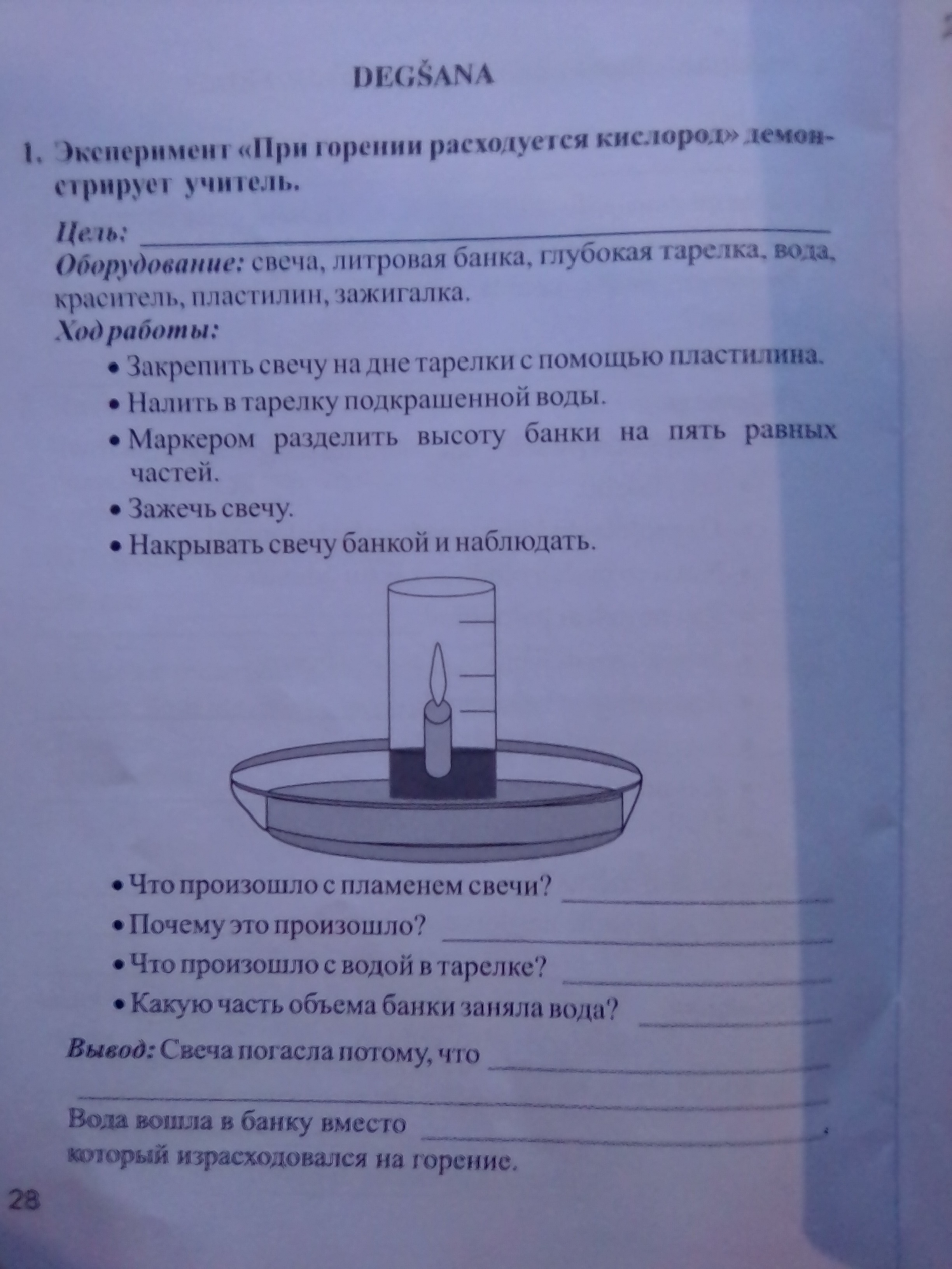 Свечка погасла, т.к горение происходит при наличии кислорода. В результате горения кислород переходит в углекислый газ. Вода поднимется в банку из за этой реакции. Примерно на 1/5