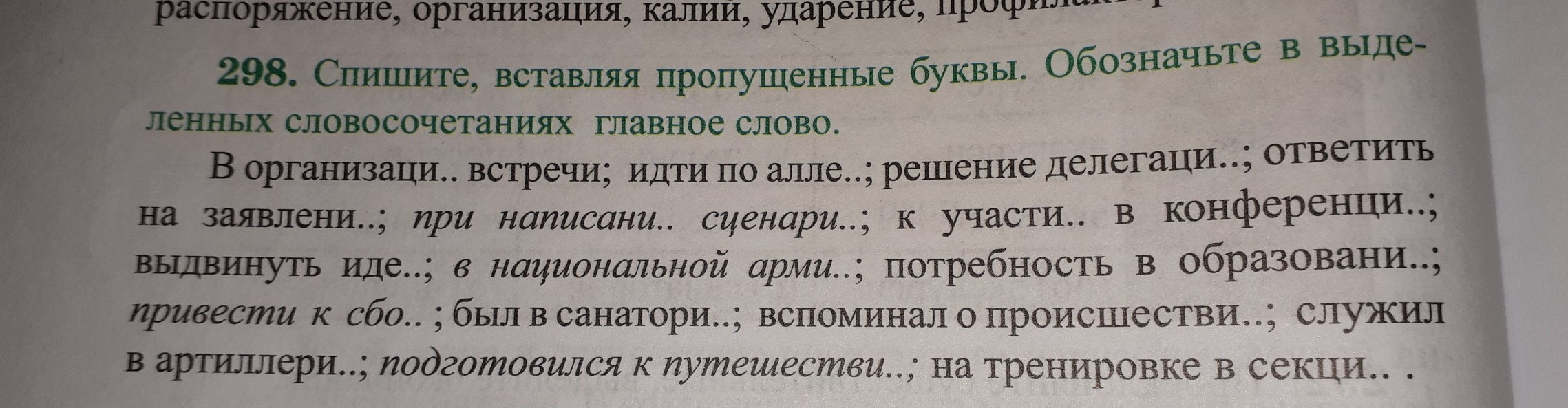 В организации встречи; идти по аллее; решение делегации; ответить на заявление; при написании сценария; к участию в конференции; выдвинуть идею; в национальной армии; потребность в образовании; привести к сбою; был в санатории; вспоминал о происшествии; служил в артиллерии; подготовился к путешествию; на тренировке в секции.