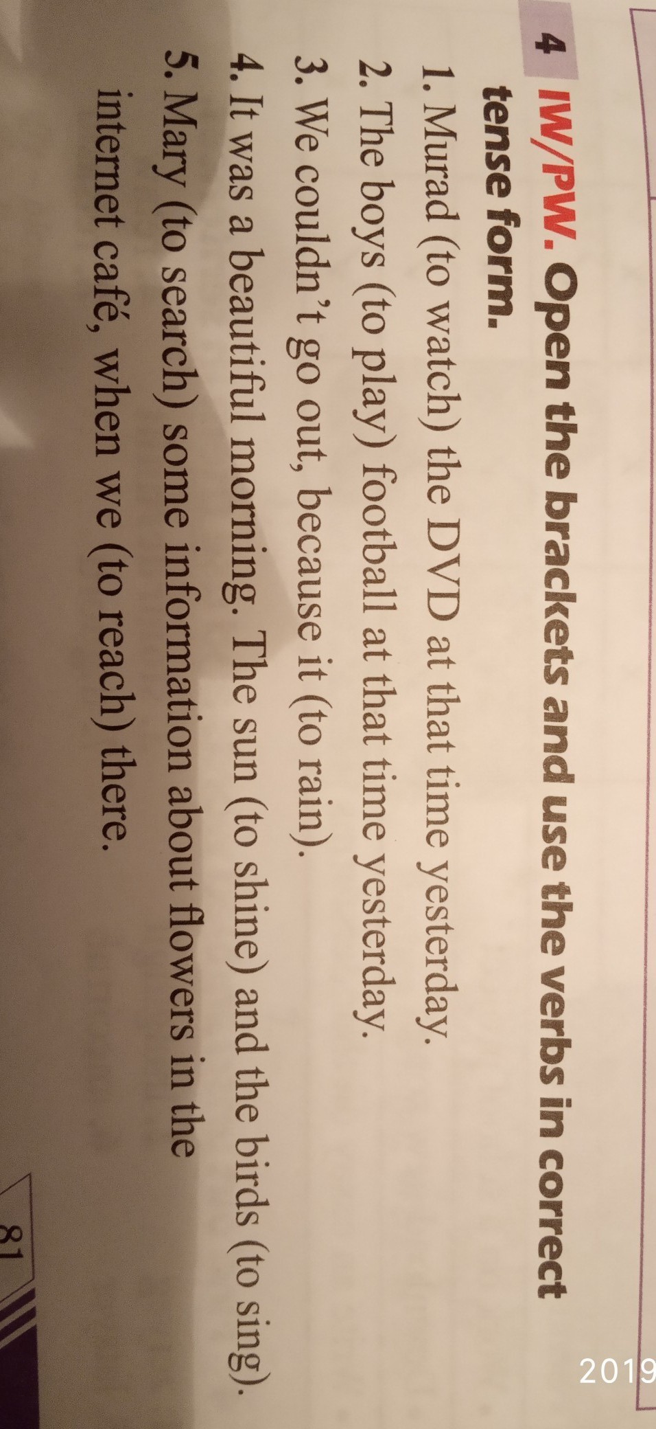 1. was watching 2. were playing 3. was raining 4. was shining, were singing 5. was searching, reached
