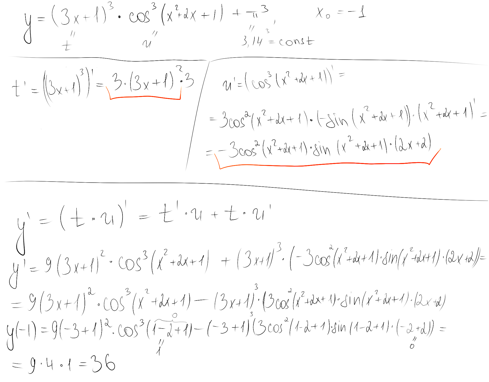 Здраствуйте помогите пожалуйста рассчитать производную... y=(3x+1)^3 * cos^3(x^2+2x+1)+P^3