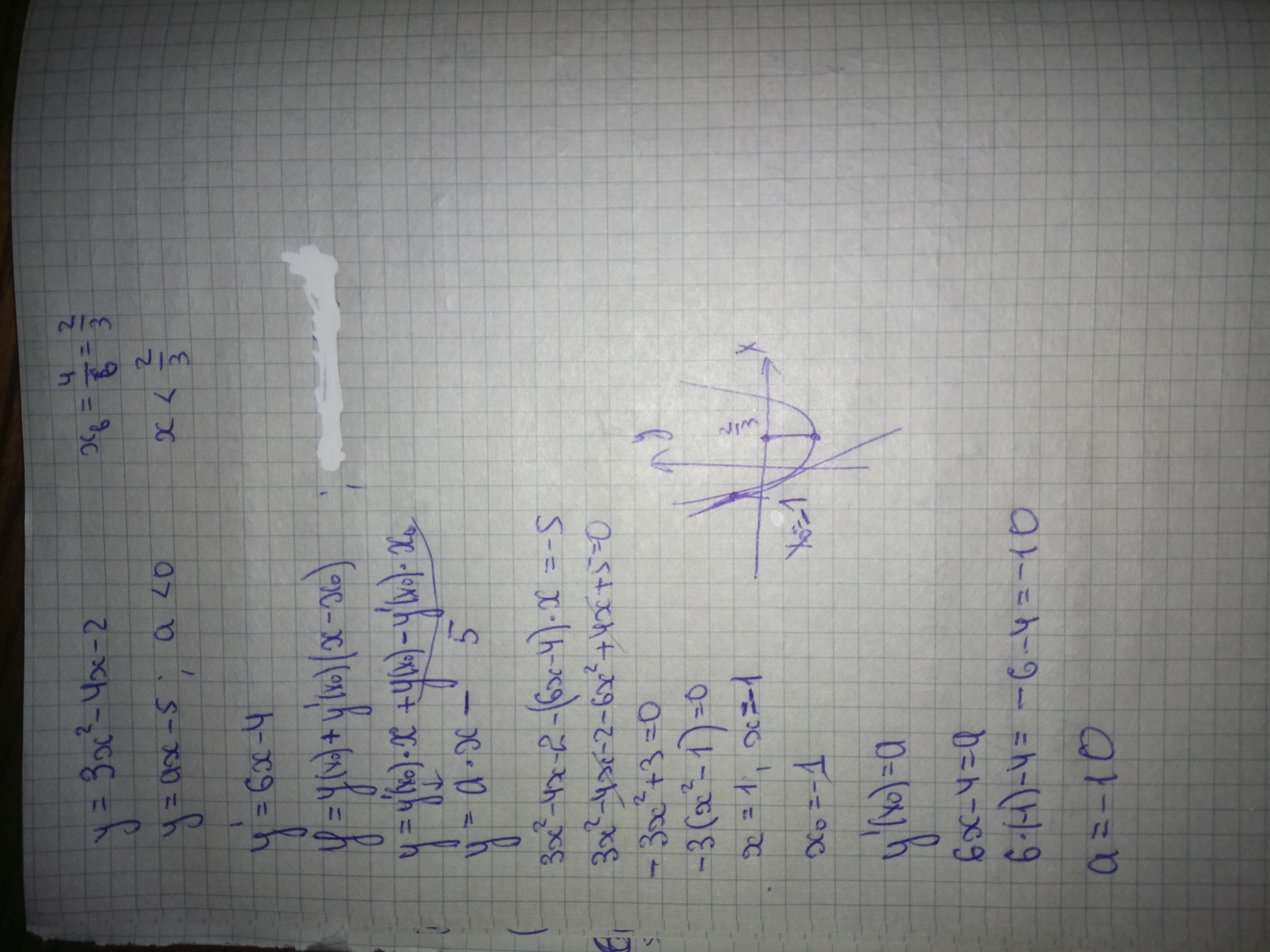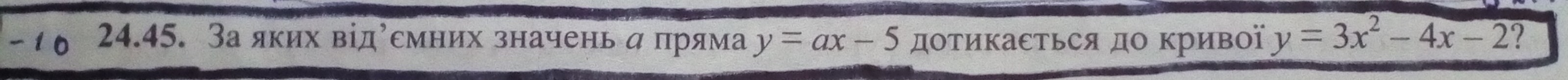 При каких отрицательных значениях а прямая y=ax-5 касается к кривой y=3x^2-4x-2