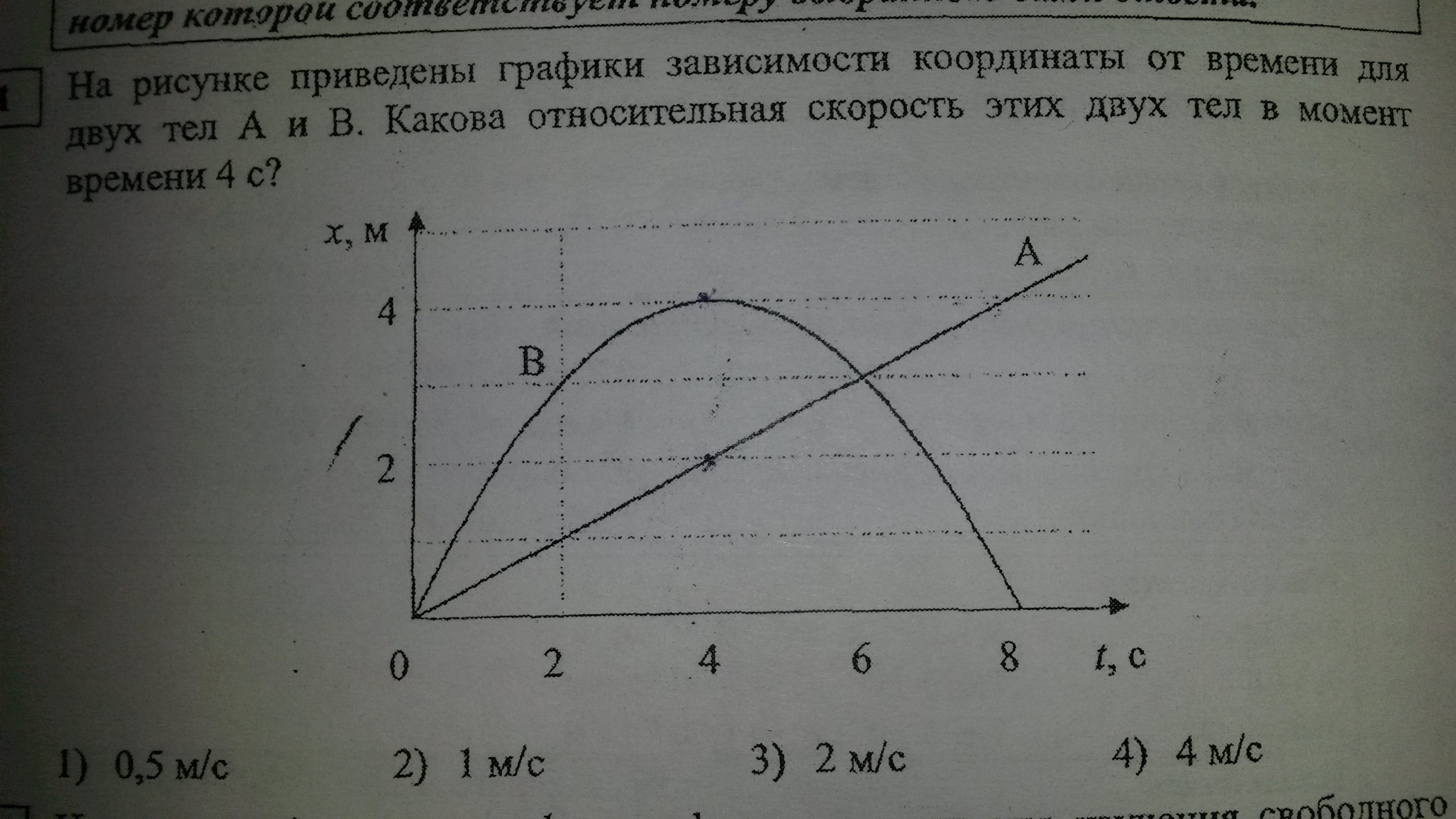 На рисунке приведены графики зависимости координаты от времени для двух тел А и В . Какова относительная скорость этих двух тел в момент времени 4 с ?