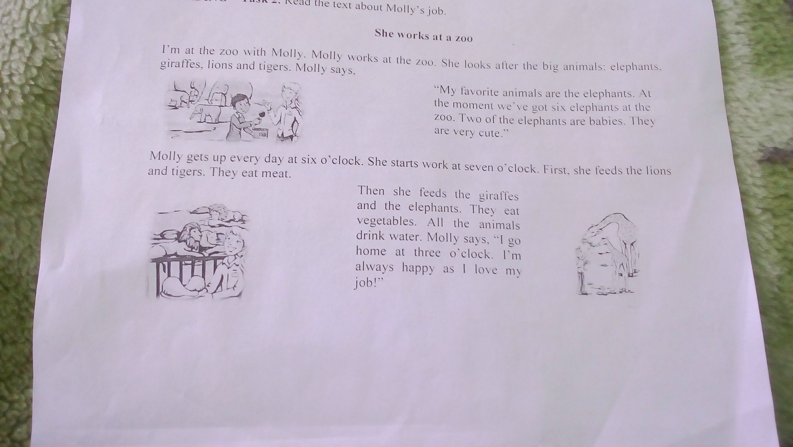 Я в зоопарке с Молли.Молли работает в зоопарке.Она присматривает за большими животными, как: слоны, жирафы,львами и тиграми. Молли говорит: