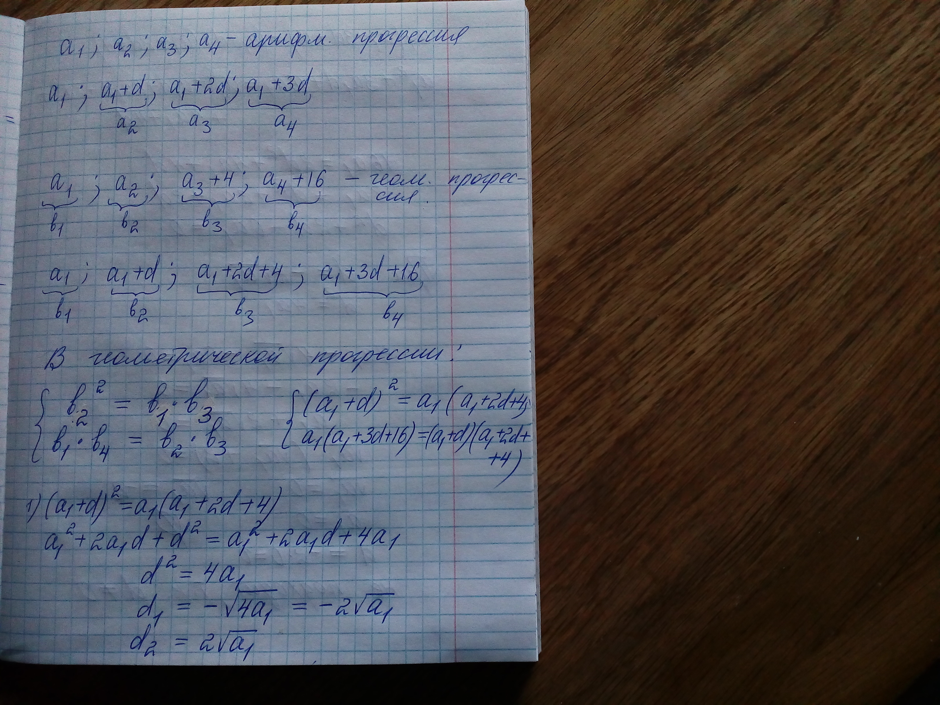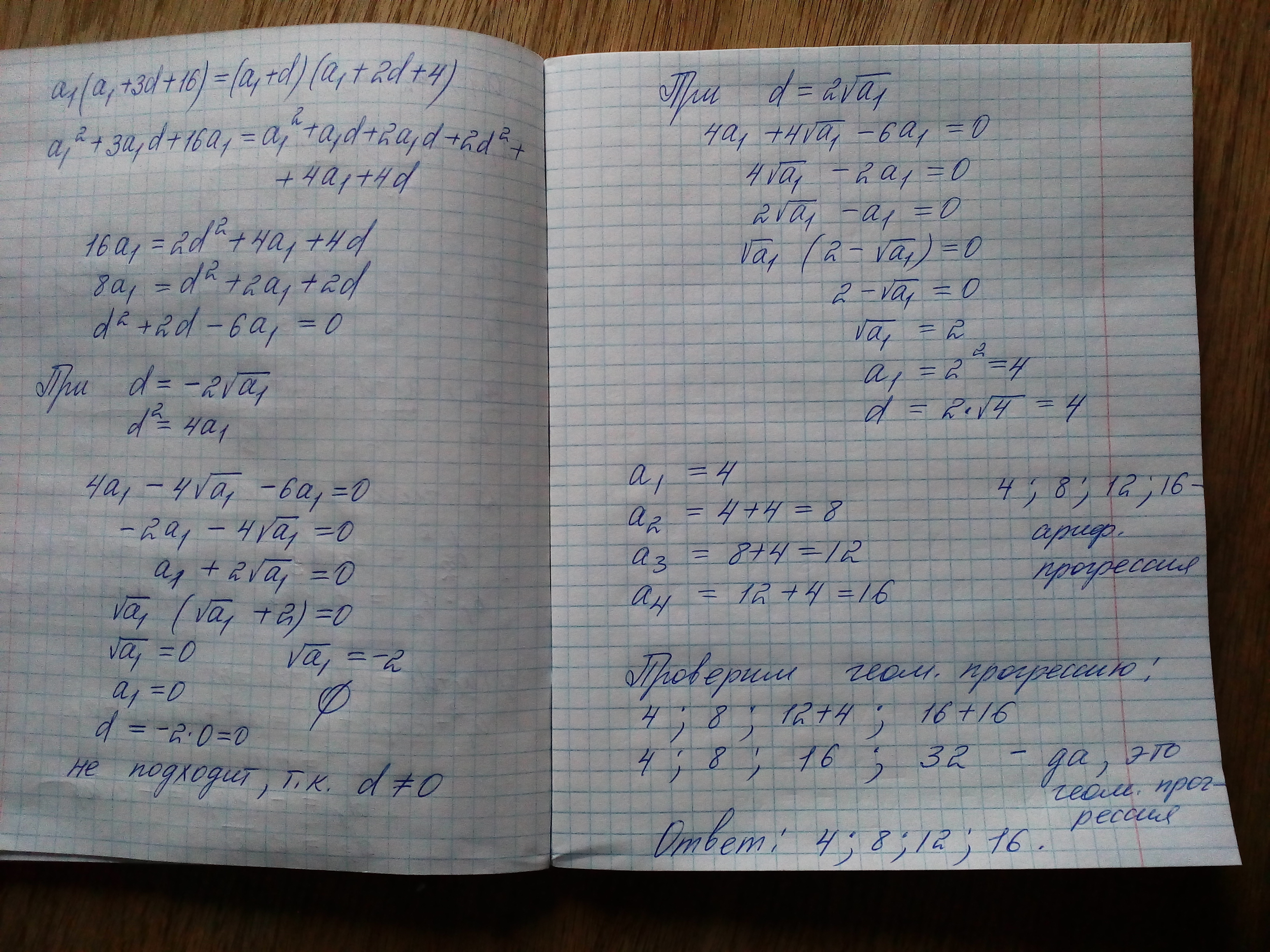 4 числа составляют арифметическую прогрессию. Если к третьем члену прибавить 4, а к четвертому 16, тогда образованные 4 числа составят геометрическую прогрессию.