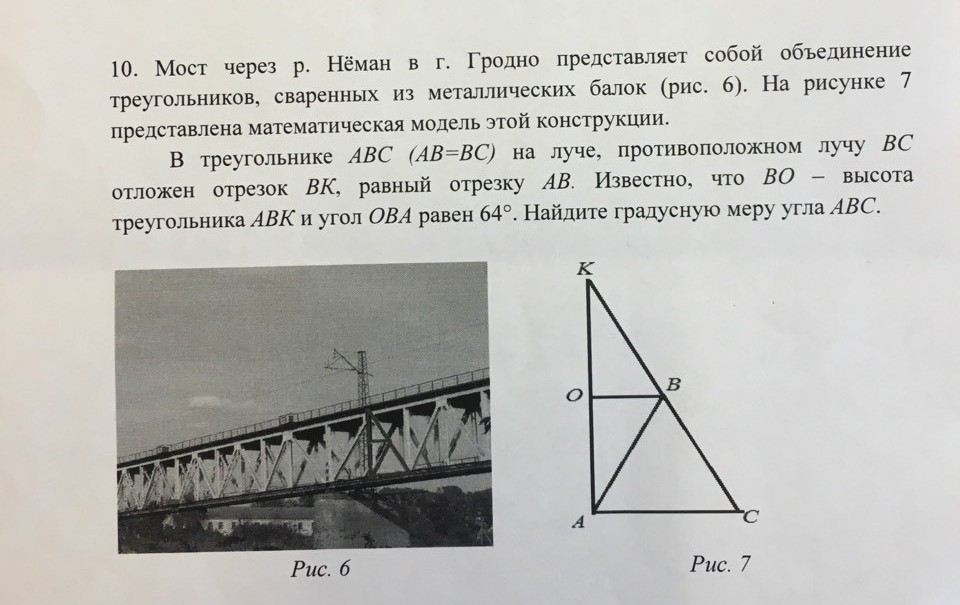 Мост через р. Нёман в г. Гродно представляет собой объединение треугольников, сваренных из металлических балок (рис. 6). На рисунке 7 представлена математическая модель этой конструкции. B треугольнике АВС (АВ-ВС) на луче, противоположном лучу ВС отложен отрезок ВК, равный отрезку AB. Известно, что - высота треугольника АВК и угол ОВА равен 64°. Найдите градусную меру угла АВС.