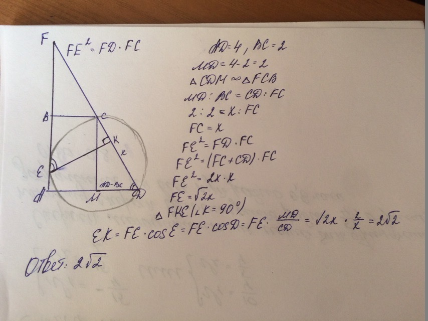В трапеции ABCD боковая сторона AB перпендикулярна основанию BC. Окружность проходит через точки C и D и касается прямой AB в точке E. Найдите расстояние от точки E до прямой CD, если AD=4, BC=2.