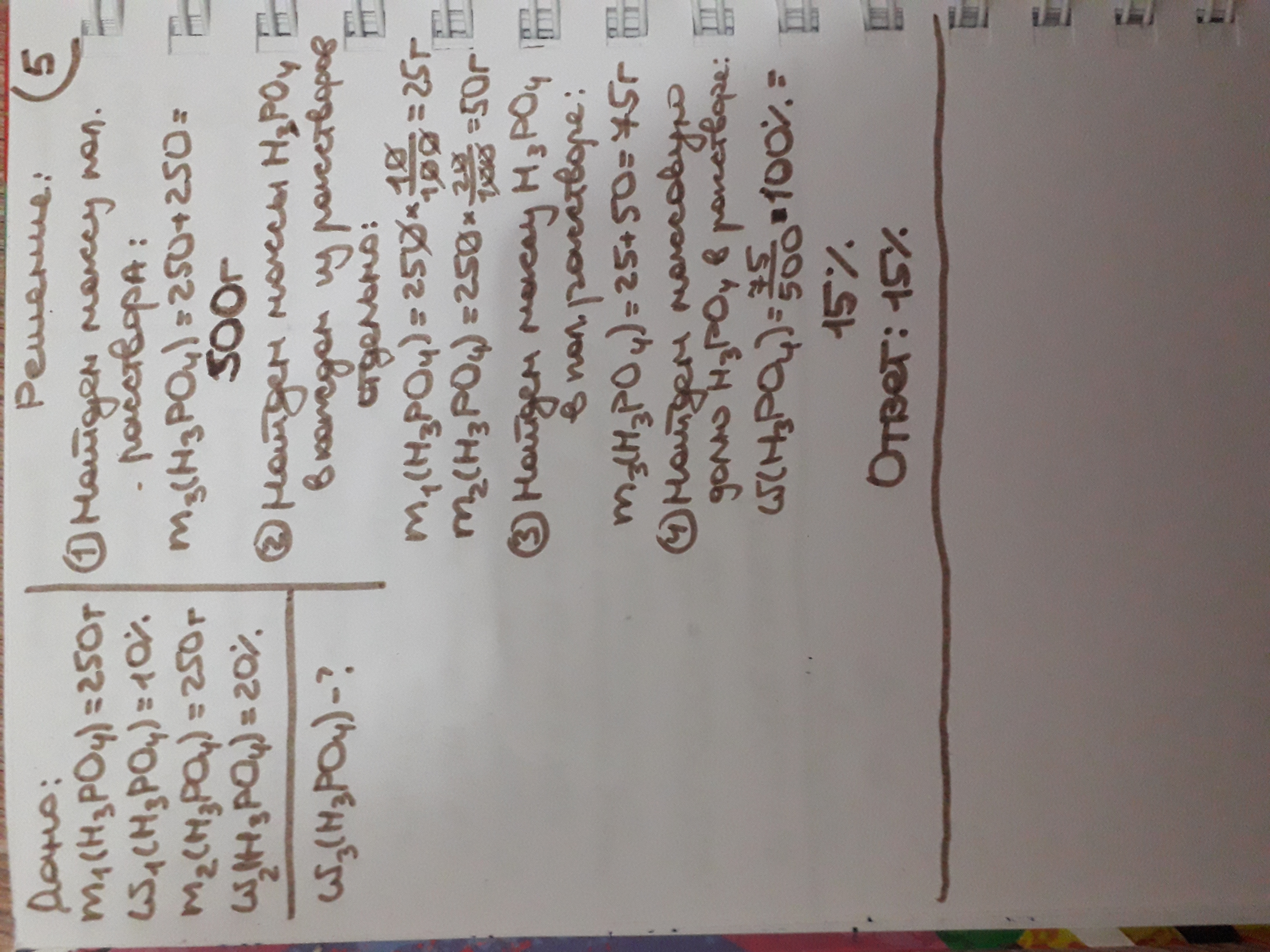 w(H3PO4)= 75/(250+250)= 0.15 = 15%