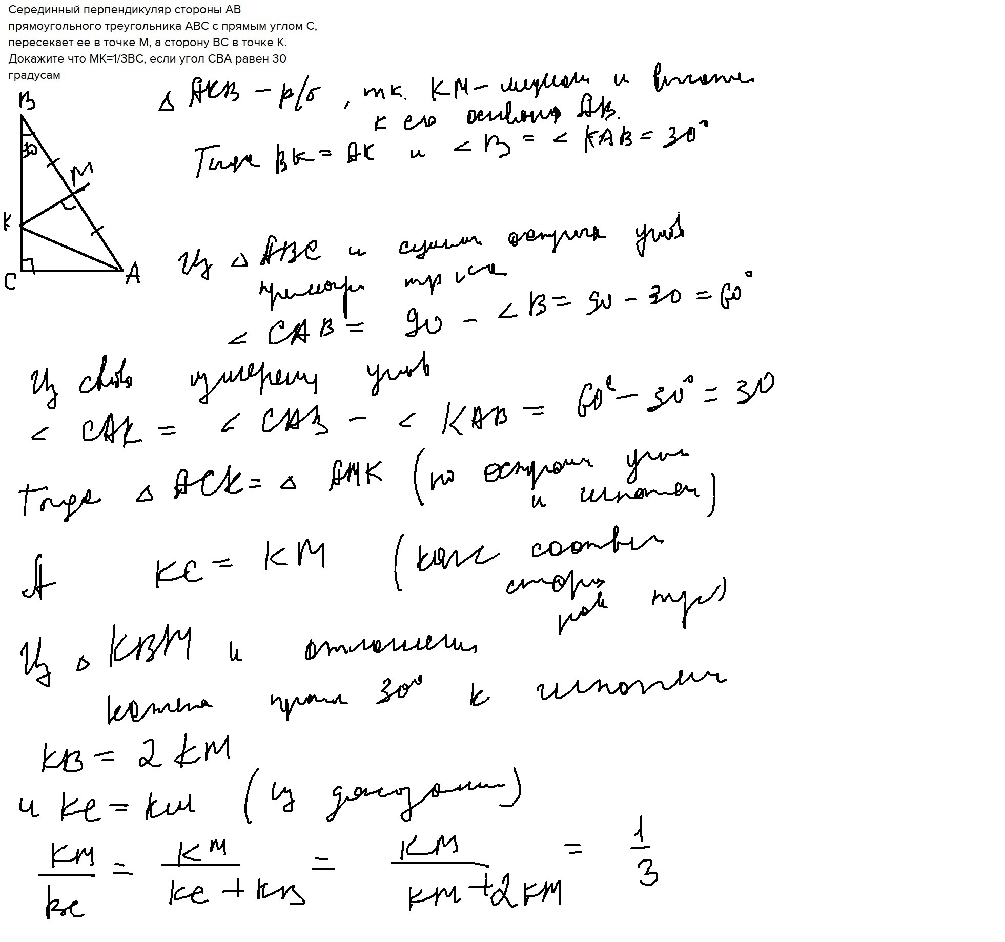 Серединный перпендикуляр стороны AB прямоугольного треугольника ABC с прямым углом C, пересекает ее в точке M, а сторону BC в точке K. Докажите что MK=1/3BC, если угол CBA равен 30 градусам