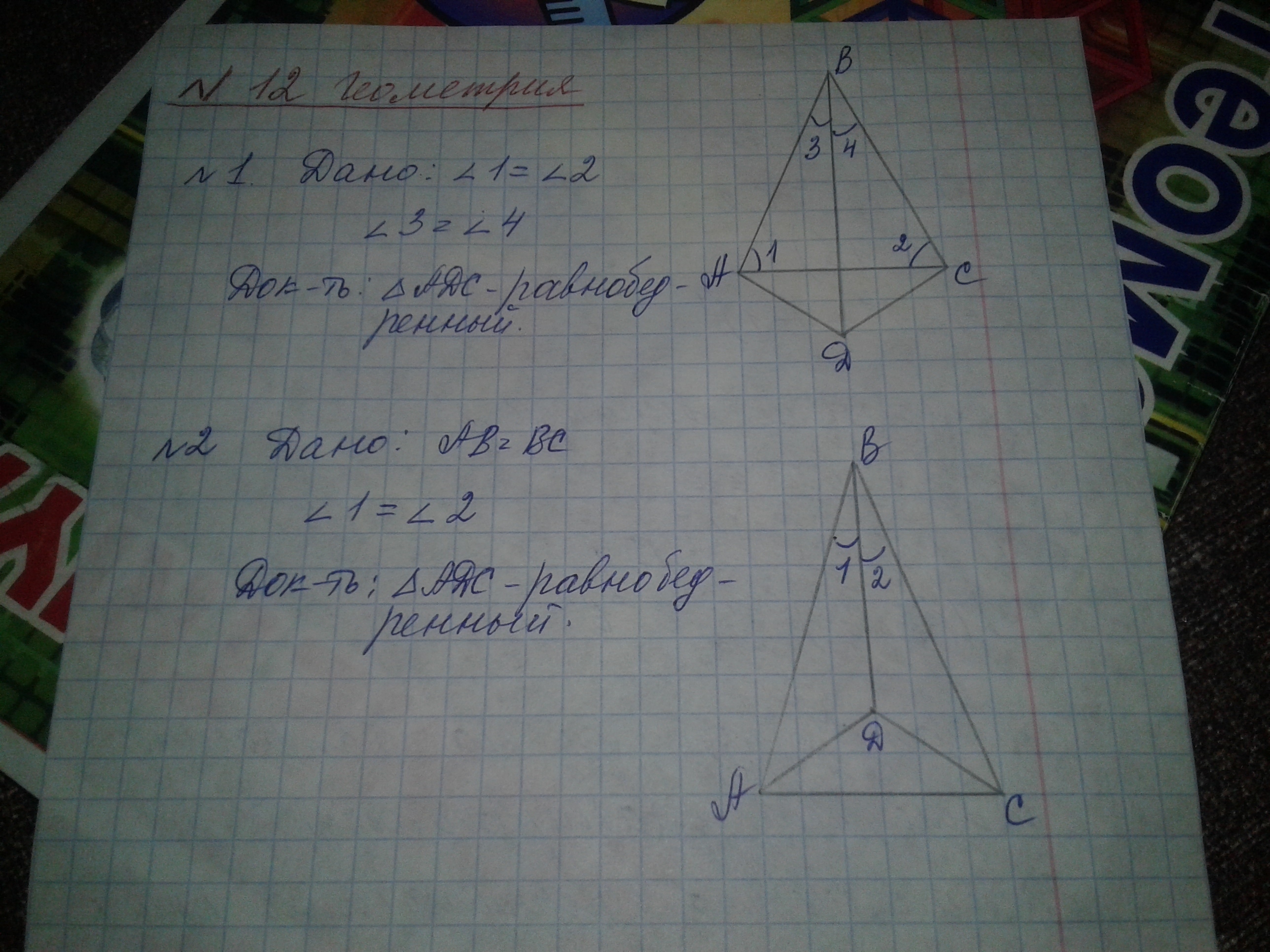 Могу решить только второе :рассмотрим треугольник ABC у него AB равно BC По условию а угол 1 равен углу 2 последовательно он равнобедренный если он равнобедренный то ооцита основания а углы при основании равны поэтому угол А равен углу C теперь рассмотрим треугольники ABC и ВDC у них AB равно BC угол 1 равен углу второму и угол А равен углу C Следовательно они равны тогда BD это биссектриса Следовательно AD равно DC и тогда треугольника АDС равнобедренный