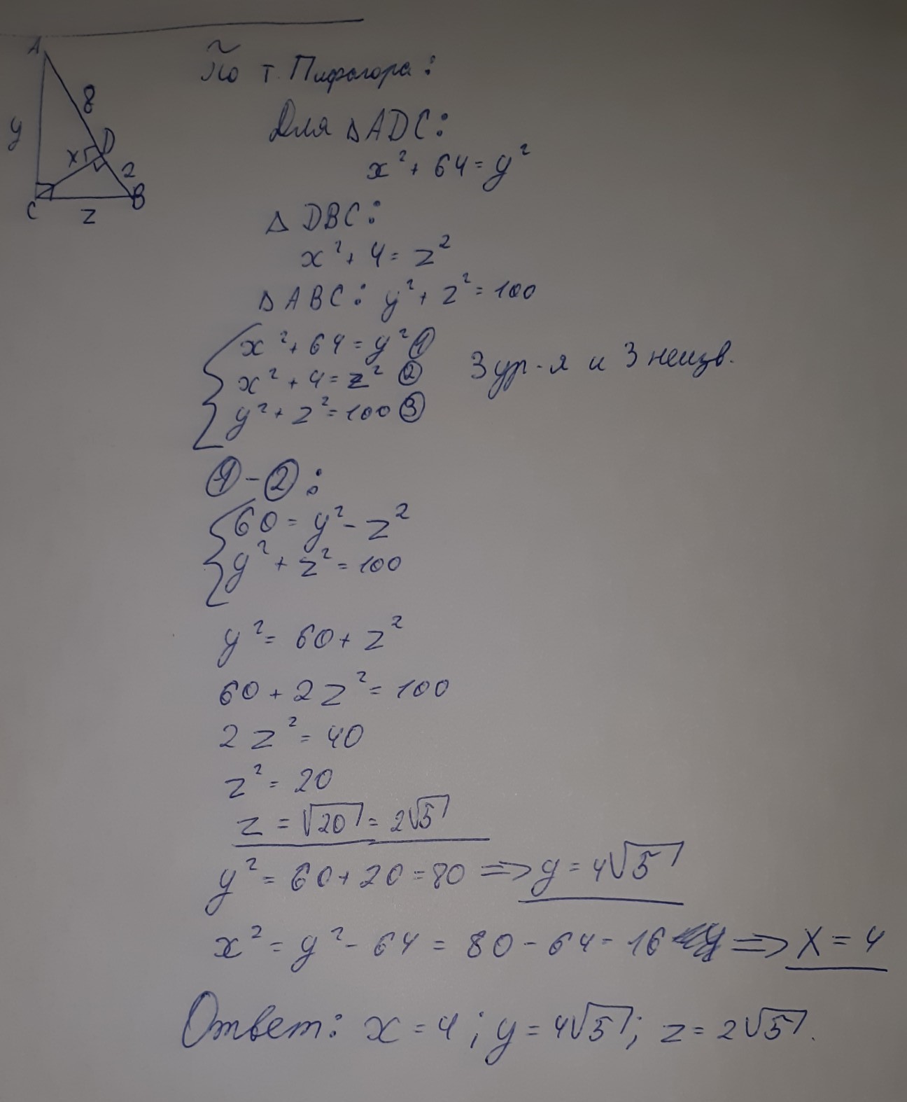 надеюсь, что всё понятно. ответ: x=4; z=2корня из 5 и y=4корня из 5.
