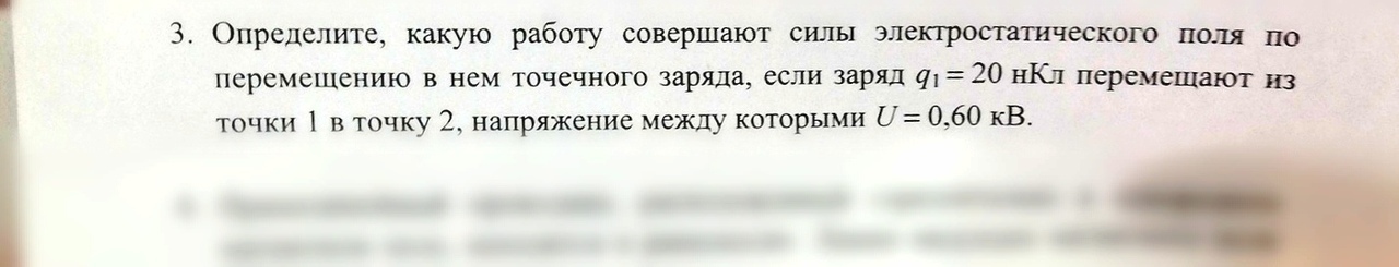 Определите, какую работу совершают силы электростатического поля по перемещению в нём точечного заряда, если заряд q1=20нКл перемещают из точки 1 в точку 2, напряжение между которыми U=0,60кВ.