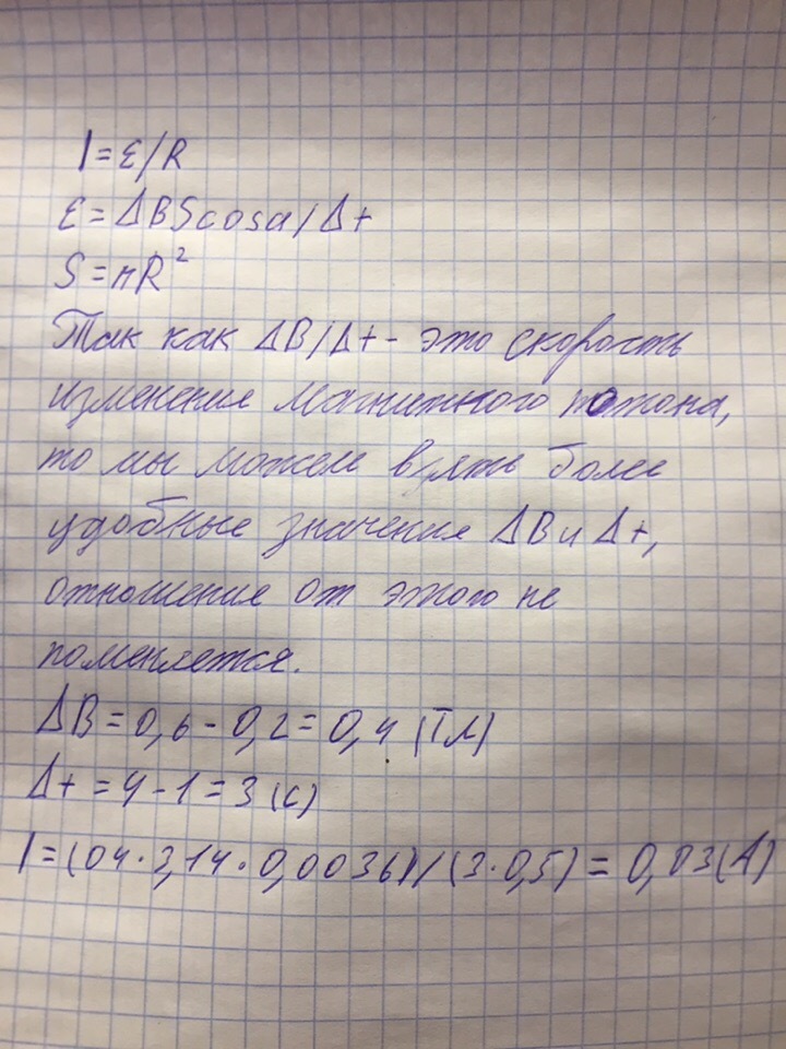На рисунке представлена зависимость от времени модуля индукции магнитного поля, в котором находится проводящее кольцо радиуса r=6см с сопротивлением R=0,5Ом. Определите силу индукционного тока в кольце в момент времени t=3с, если линии индукции магнитного поля перпендикулярны плоскости кольца