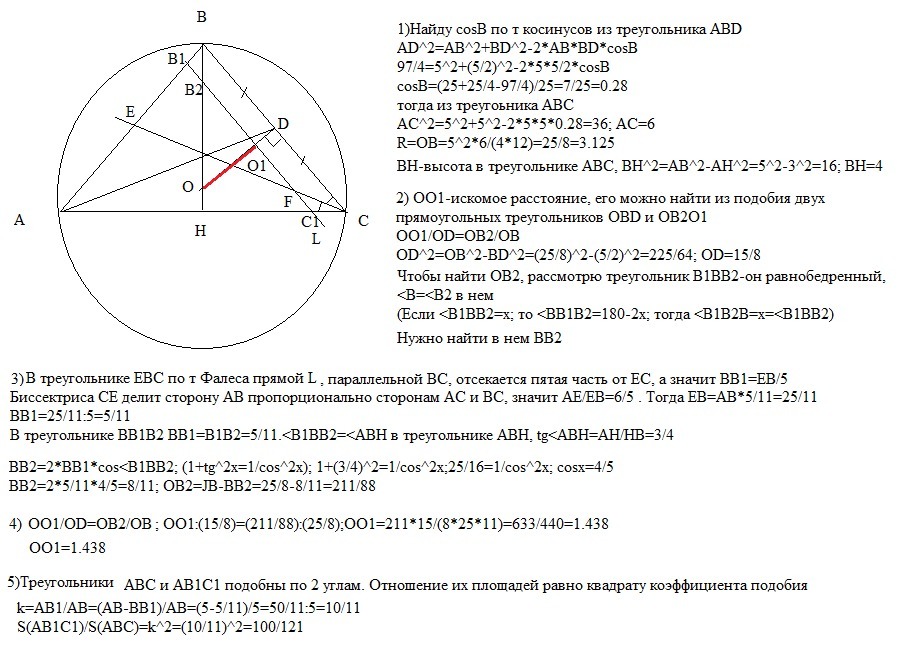 Дан треугольник АВС, в котором АВ = ВС= 5, медиана AD = √(97)/2 . На биссектрисе CE выбрана точка F такая, что CE = 5CF. Через точку F проведена прямая l, параллельная ВС.