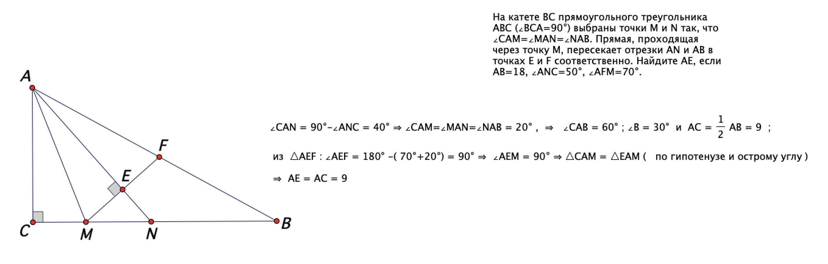 На катете BC прямоугольного треугольника ABC (∠BCA=90°) выбраны точки M и N так, что ∠CAM=∠MAN=∠NAB. Прямая, проходящая через точку M, пересекает отрезки AN и AB в точках E и F соответственно. Найдите AE, если AB=18, ∠ANC=50°, ∠AFM=70°.