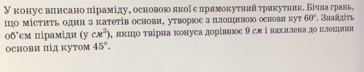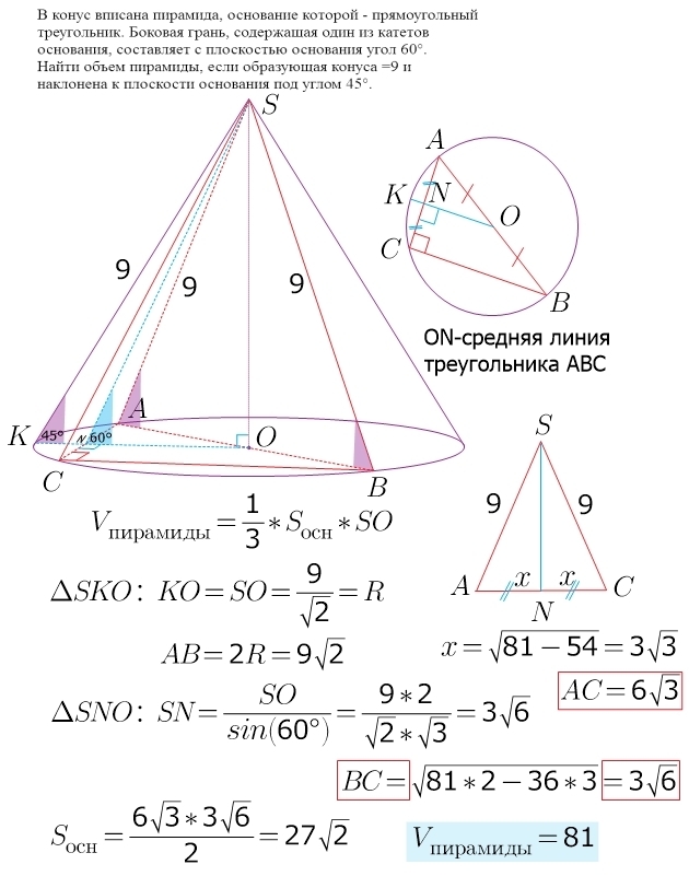 2) высота пирамиды=высоте конуса и, чтобы построить линейный угол в 60°, нужно опустить перпендикуляр на катет... это будет средняя линия прямоугольного треугольника (ON); и все боковые грани пирамиды-равнобедренные треугольники...