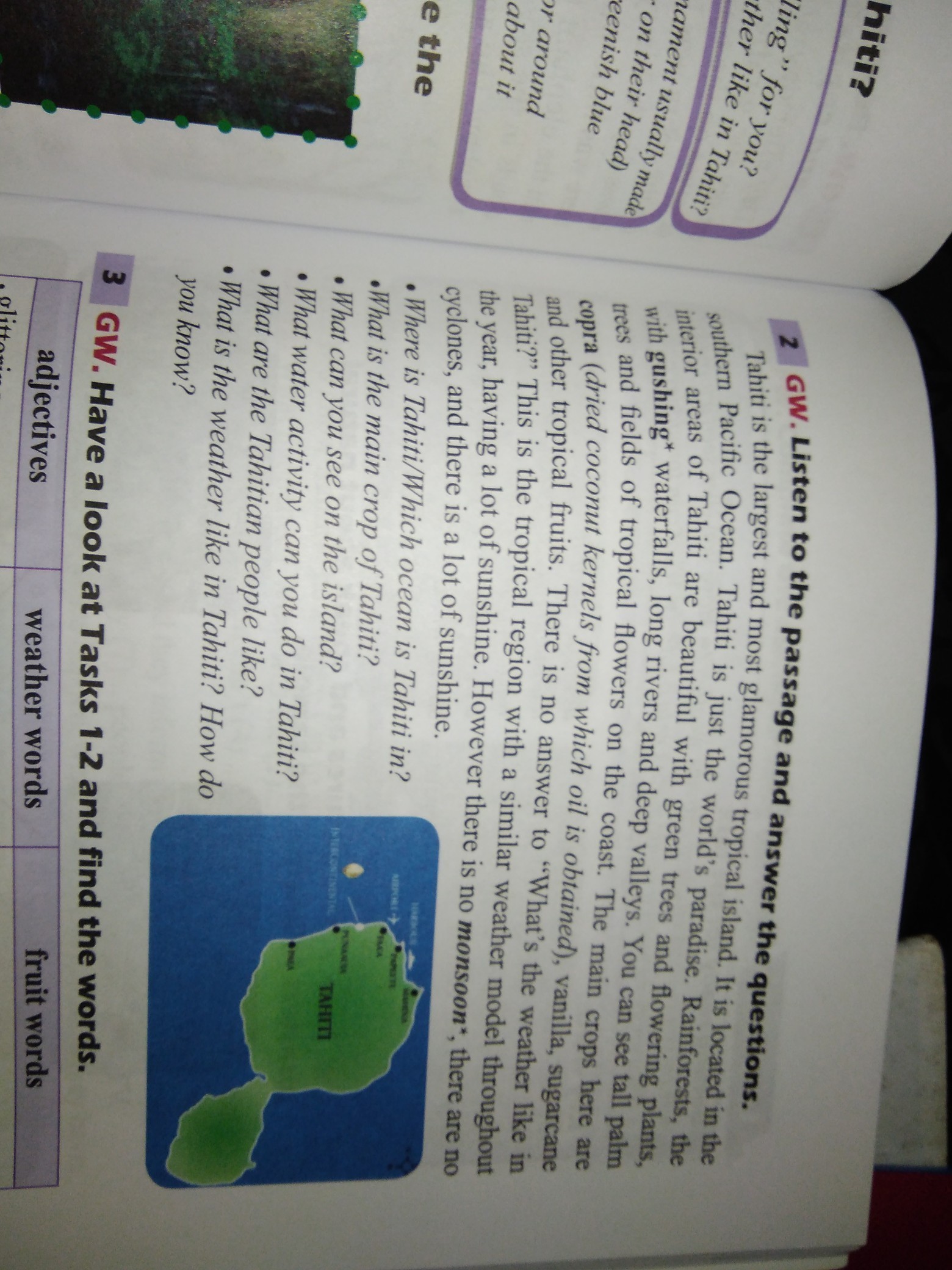2. The main crops of Tahiti are copra, vanilla, sugarcane and other tropical fruits.