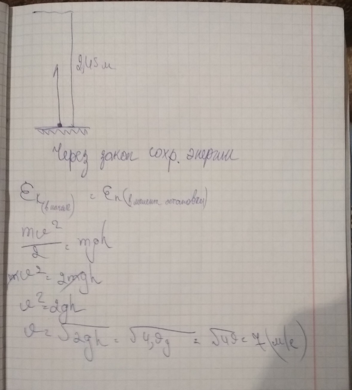 Какую скорость нужно сообщить телу массой 50г,чтобы оно поднялось на высоту 2.45м.(Напишите полностью решения на листке,спасибо)