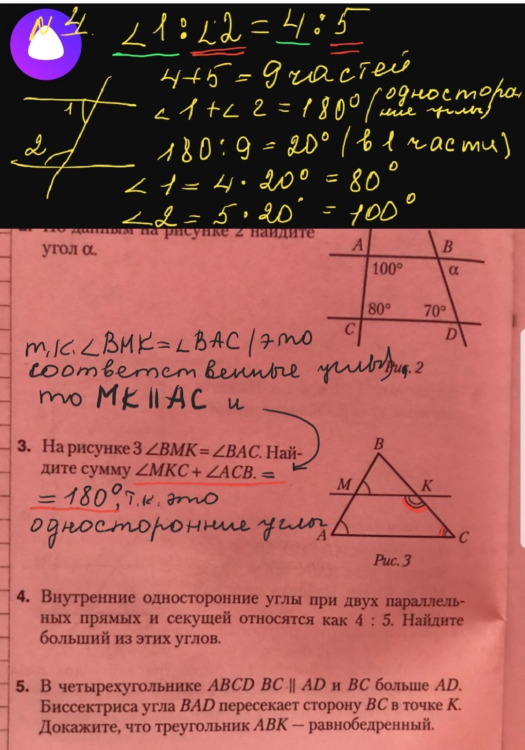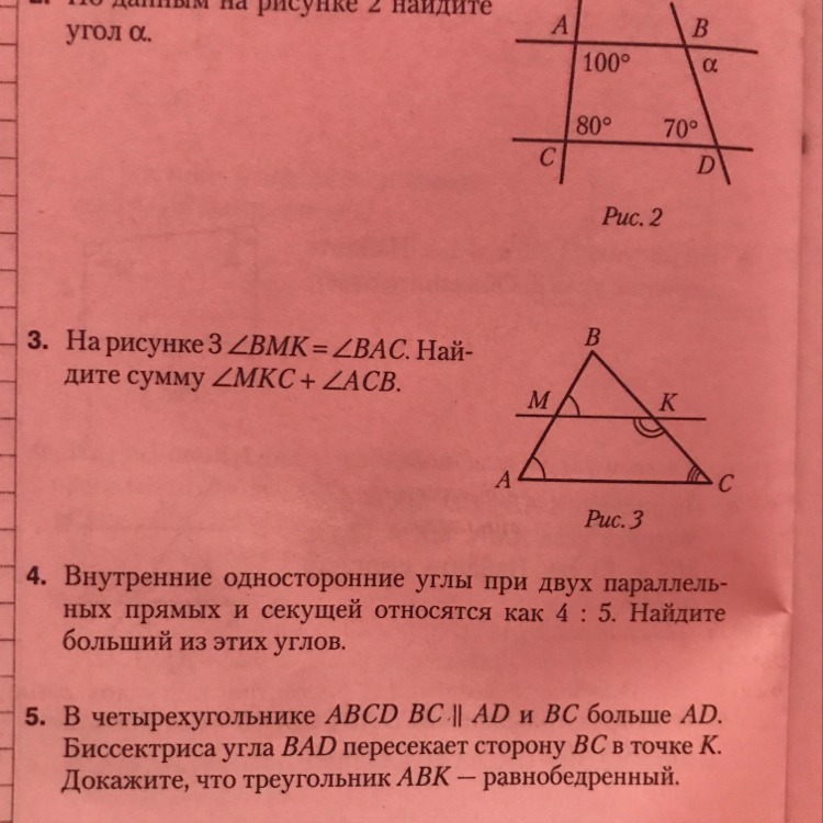 Если прямые параллельны, то при пересечении их секущей сумма односторонних углов равна 180°,