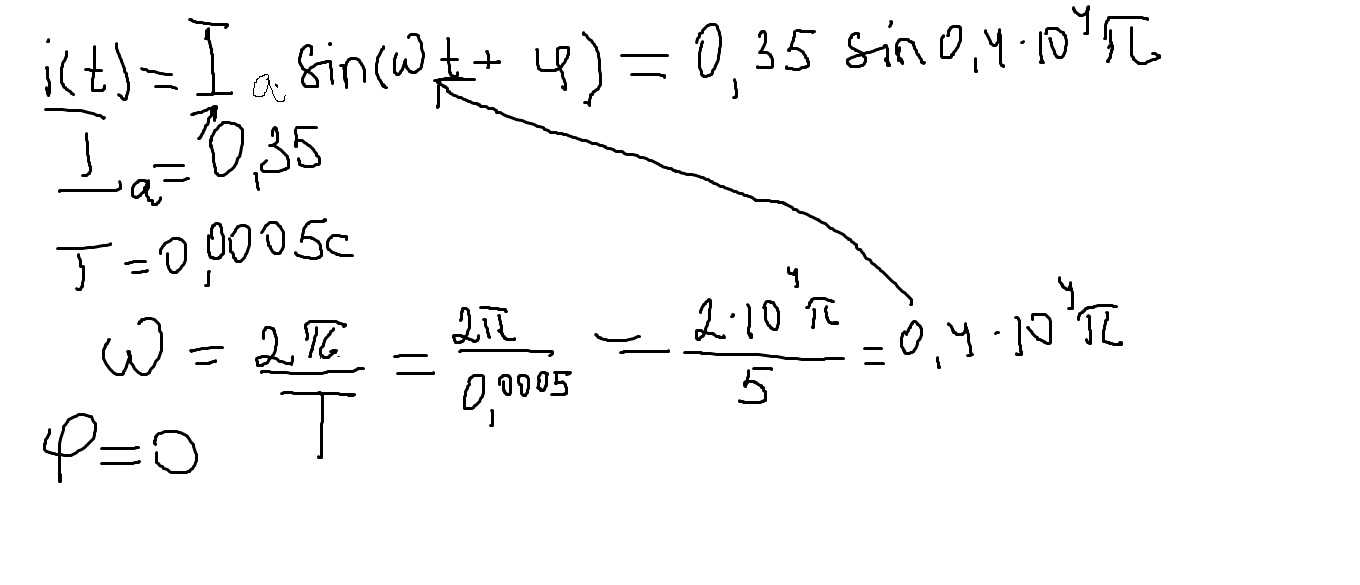 Составить уравнение гармонического колебания силы тока в колебательном контуре, если амплитудное значение тока равно 0,35 А и период колебания 0,0005с. Начальная фаза колебания равна нулю.