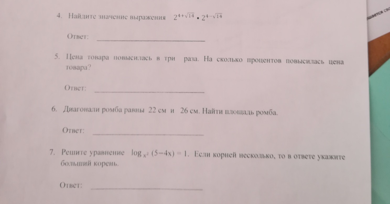 4. 2^(4 + √14) · 2^(4 - √14) = 2^(4 + √14 + 4 - √14) = 2^8 = 256