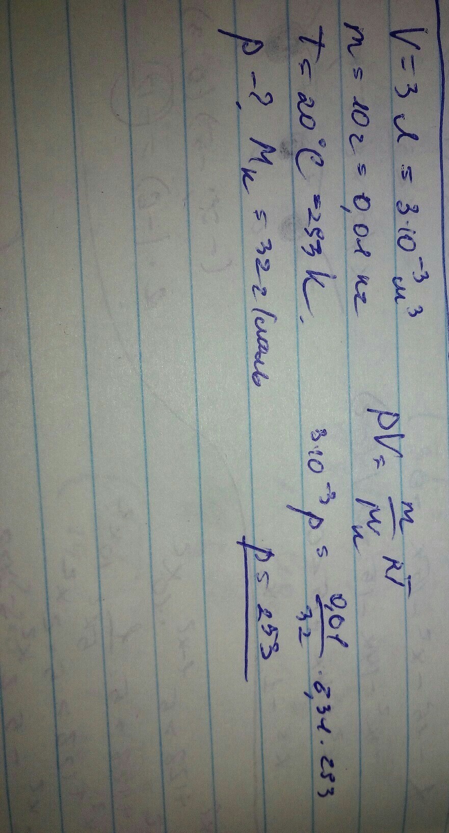 В баллоне объемом 3 м находится 10 г кислорода при температуре 20 градусов. Какое давление газа в баллоне? Малярнная масса кислорода 32 г/моль