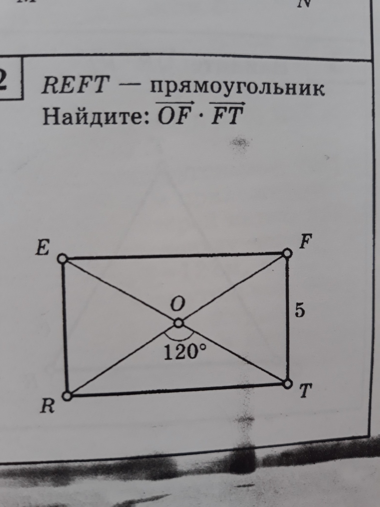 В прямоугольнике диагонали равны и точкой пересечения делятся пополам. Получилось, что RO=OT=OF=EO. Треугольник ROT равнобедренный, угол R или T в нём=(180-120)/2=30°. В прямоугольнике угол Т=90°, тогда в равнобедренном треугольнике TOF=90-30=60°, как и угол F там же. Тогда в этом же треугольнике угол O= 180-60*2=60°. Значит, что треугольник OFT равносторонний. FT=OF=OT=5см. OF*FT=5^2=25