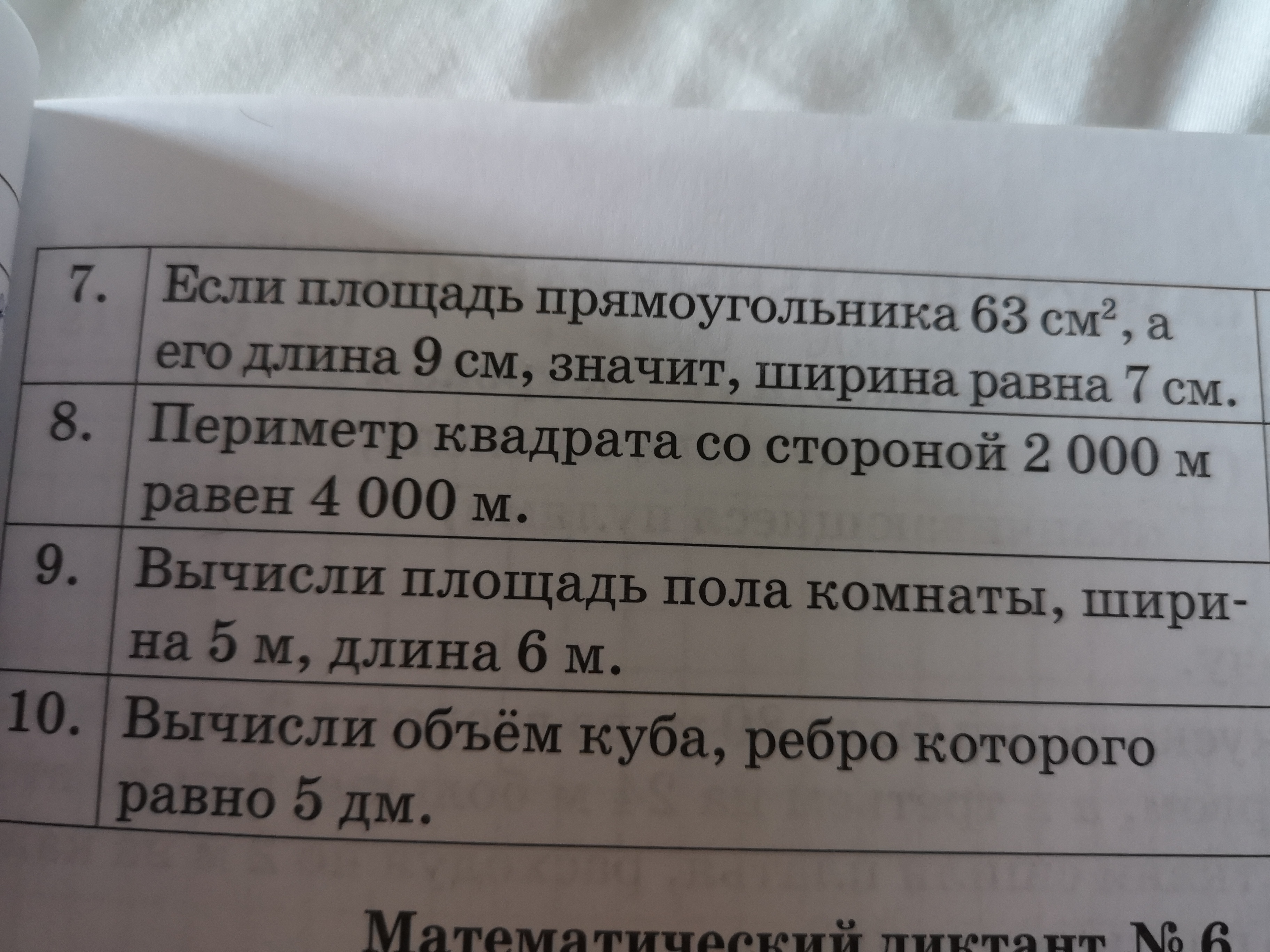 Ответ: 7-да(+),8-нет(-),9- 5*6=30 м^2(во второй степени), 10- 5*5*5=125 дм^3( в третьей степени)