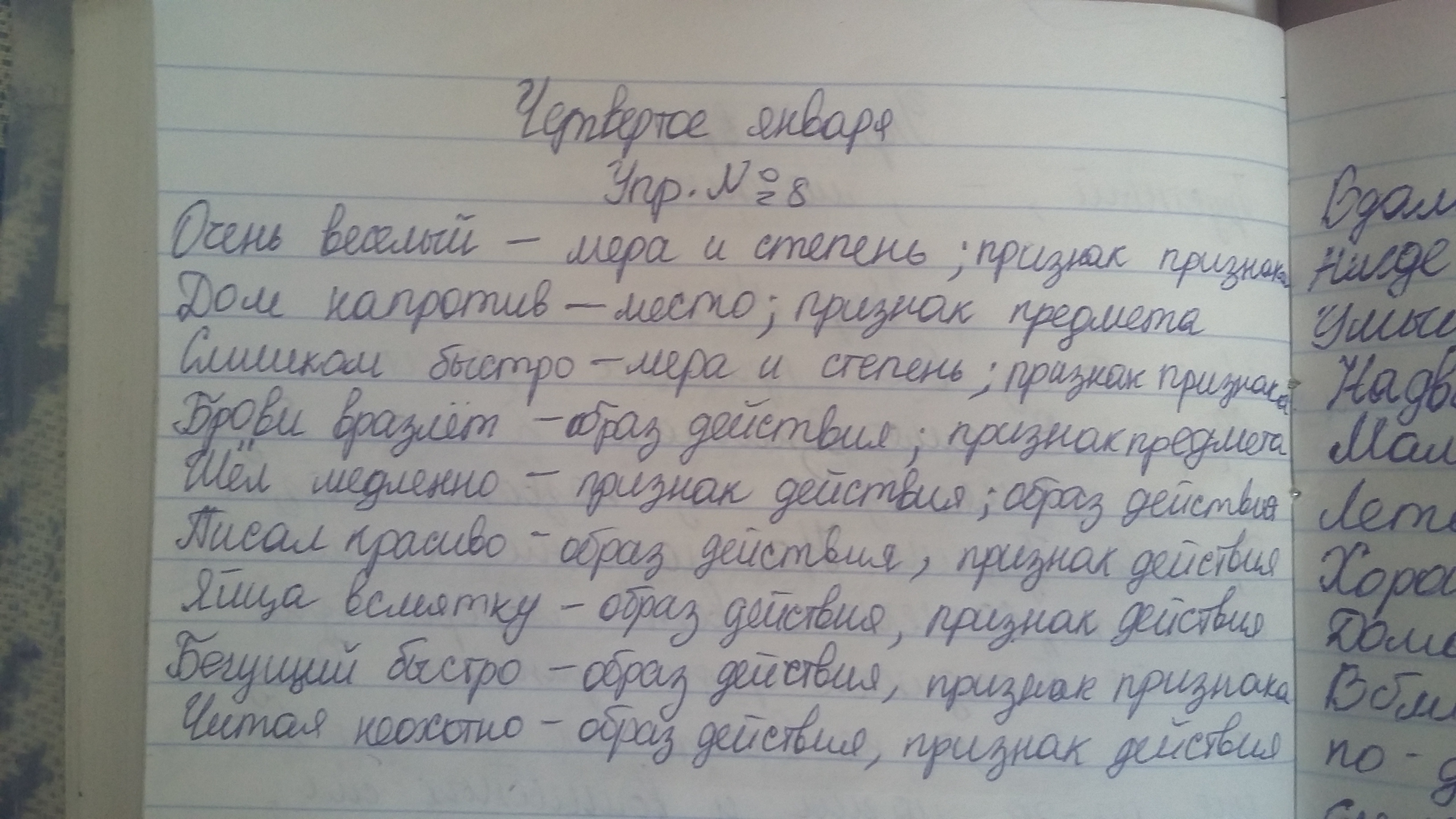 Определите значение наречий очень веселый,дом напротив,слишком быстро,брови вразлет,шел медленно,писал красиво,яйца всмятку,бегущий быстро,читая неохотно