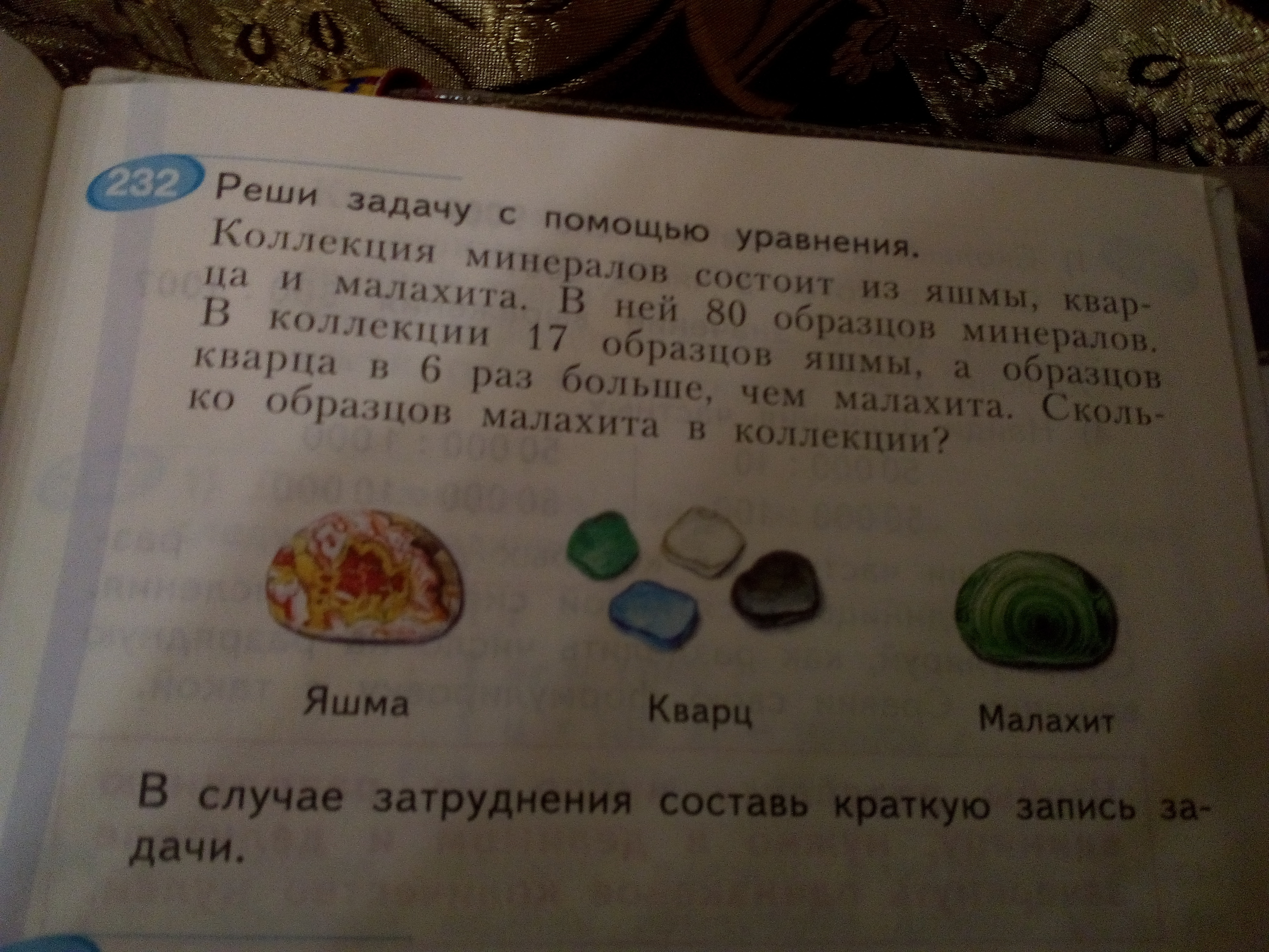 Обозначим количество малахита за х. Тогда количество кварца - 6х. Количество яшмы - 17 образцов. Составим уравнение: