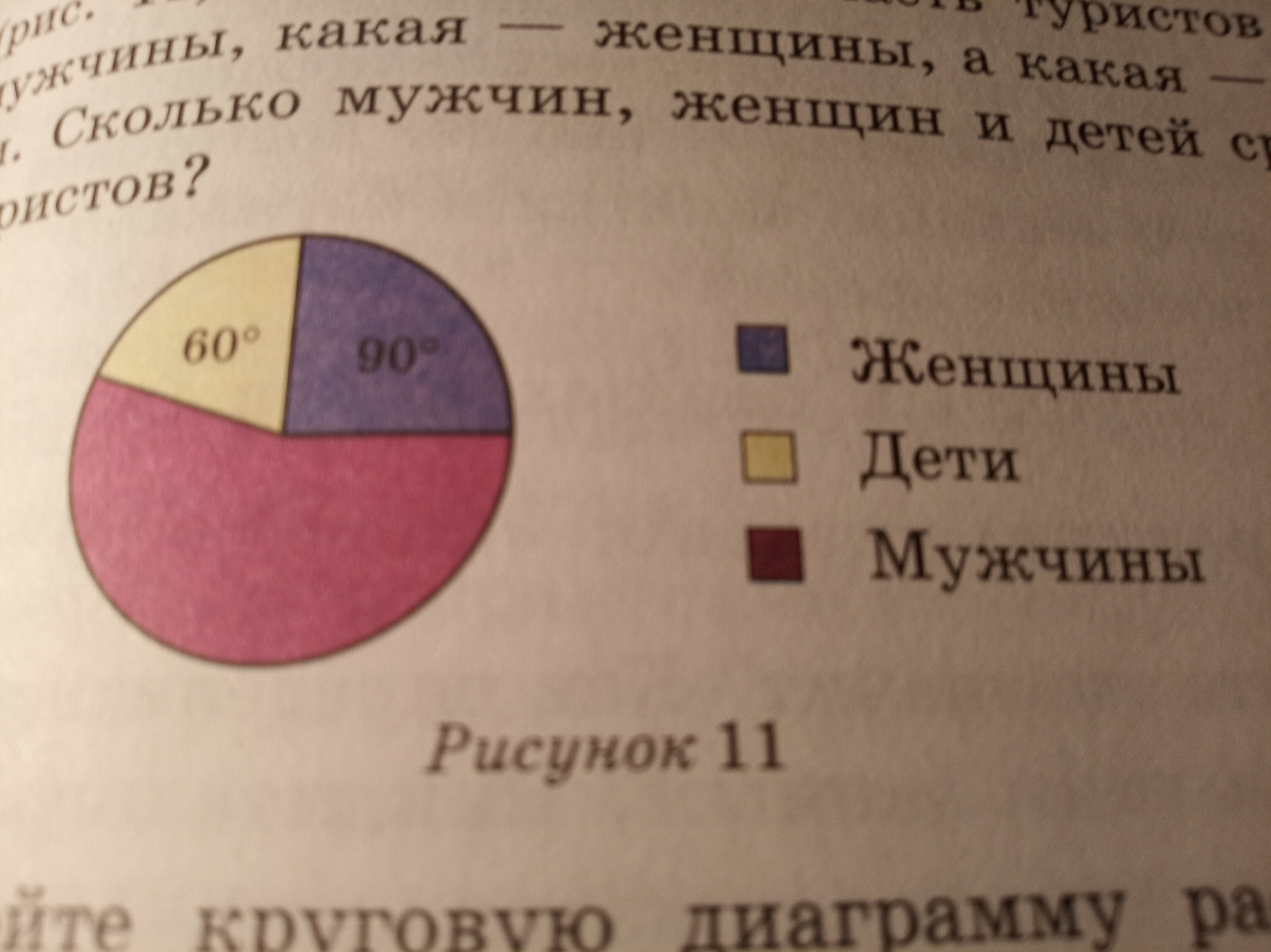 СРОЧНО! На экскурсию в брестскую крепость 9 мая прибыло 7200 туристов. На диаграмме показано, какая часть туристов - мужчины, какая - женщины, а какая - дети. Сколько мужчин, женщин и детей среди туристов