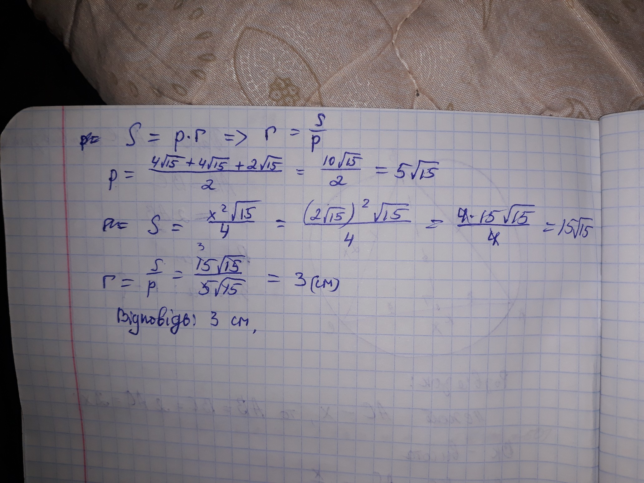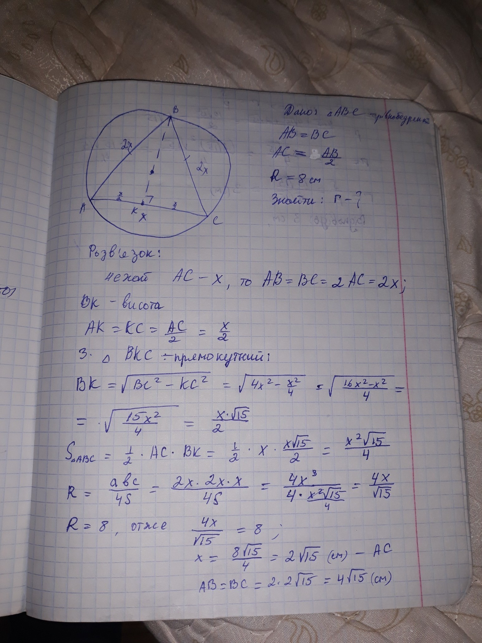 У коло,радіус якого 8 см вписано рівнобедренний трикутник,бічна сторона якого вдвічі більша за основу,знайдіть радуіс кола,вписаний у цей трикутник.