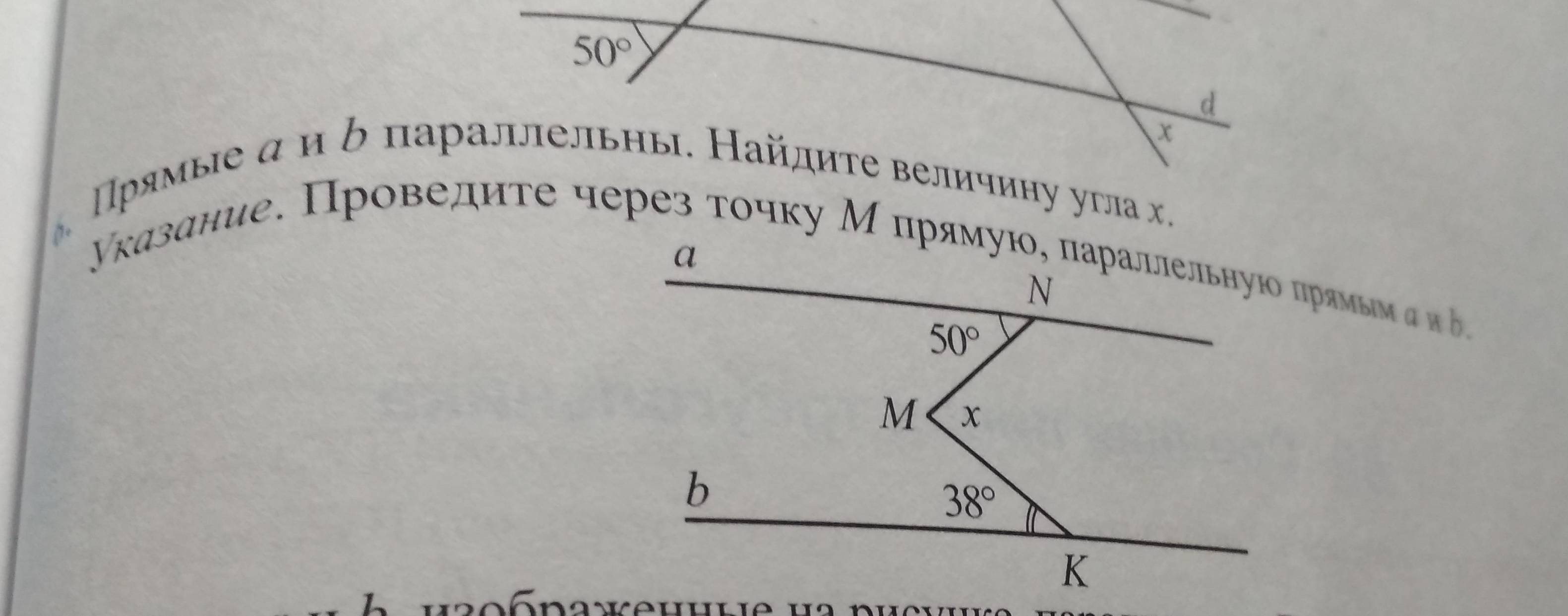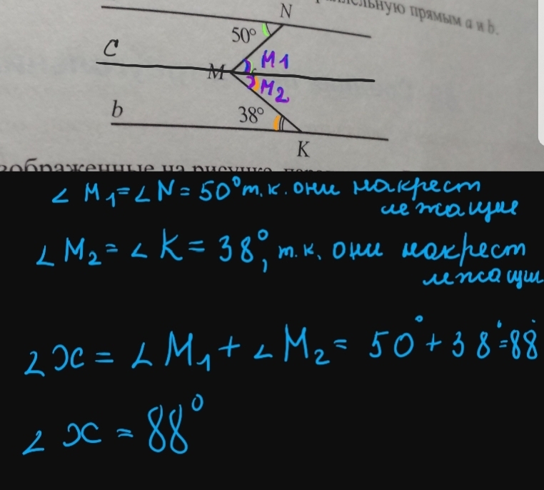 Через точку М проведем прямую С параллельную а и b.(c ll a ll b).Прямая С разделит угол М(x) на два угла-М1 и М2.