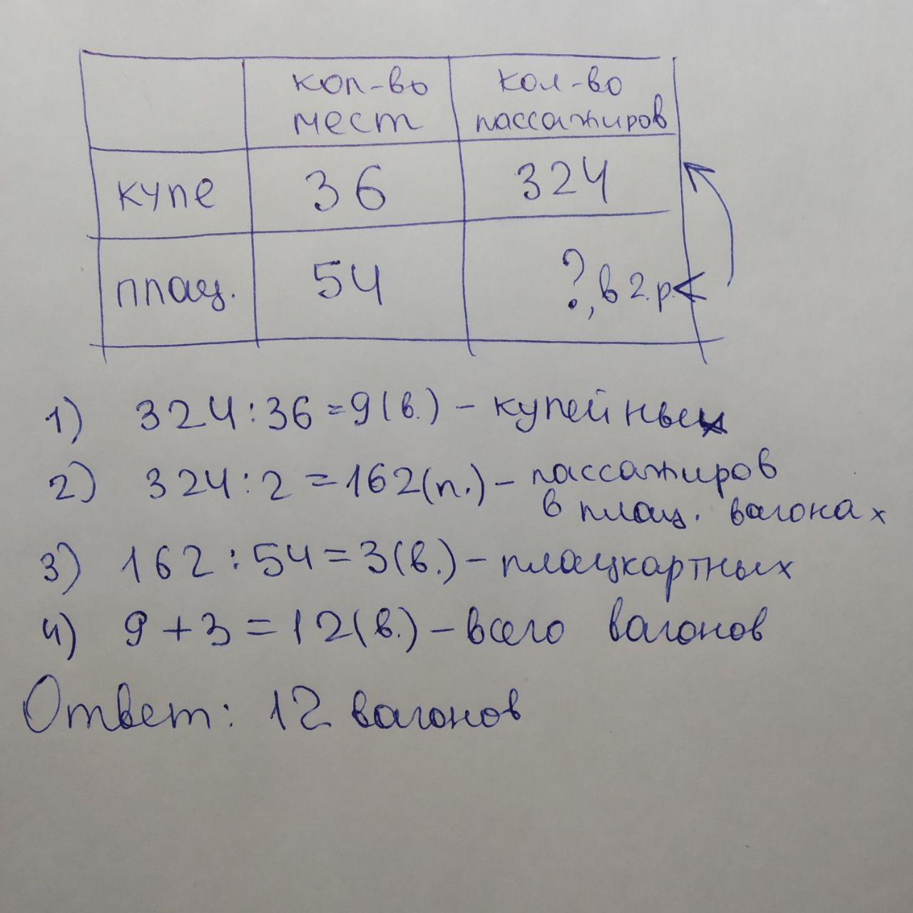 решить задачу с краткой записью . В купейных вагонах едут 324 пассажира .Это в два раза больше,чем пассажиров в плацкартных вагонах.Сколько вагонов в поезде,если в плацкартном вагоне 54 места,а в купейном 36?