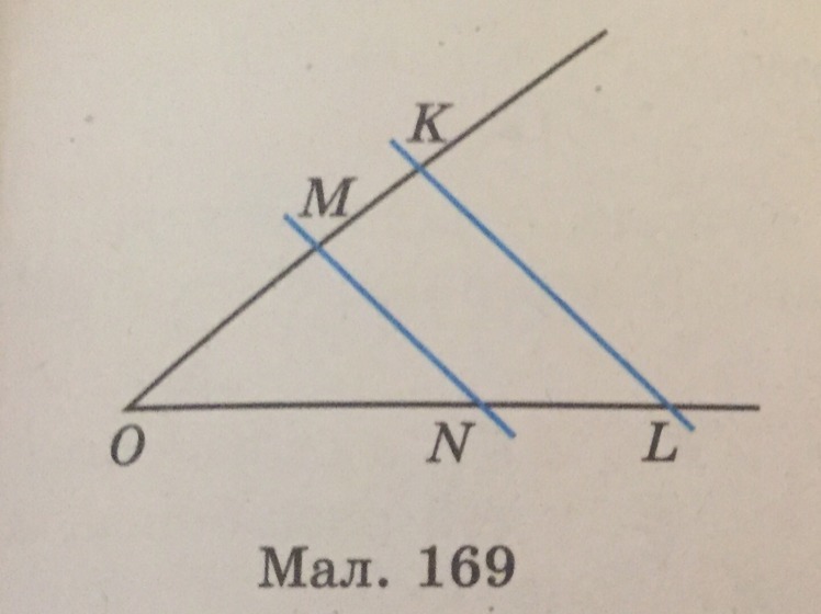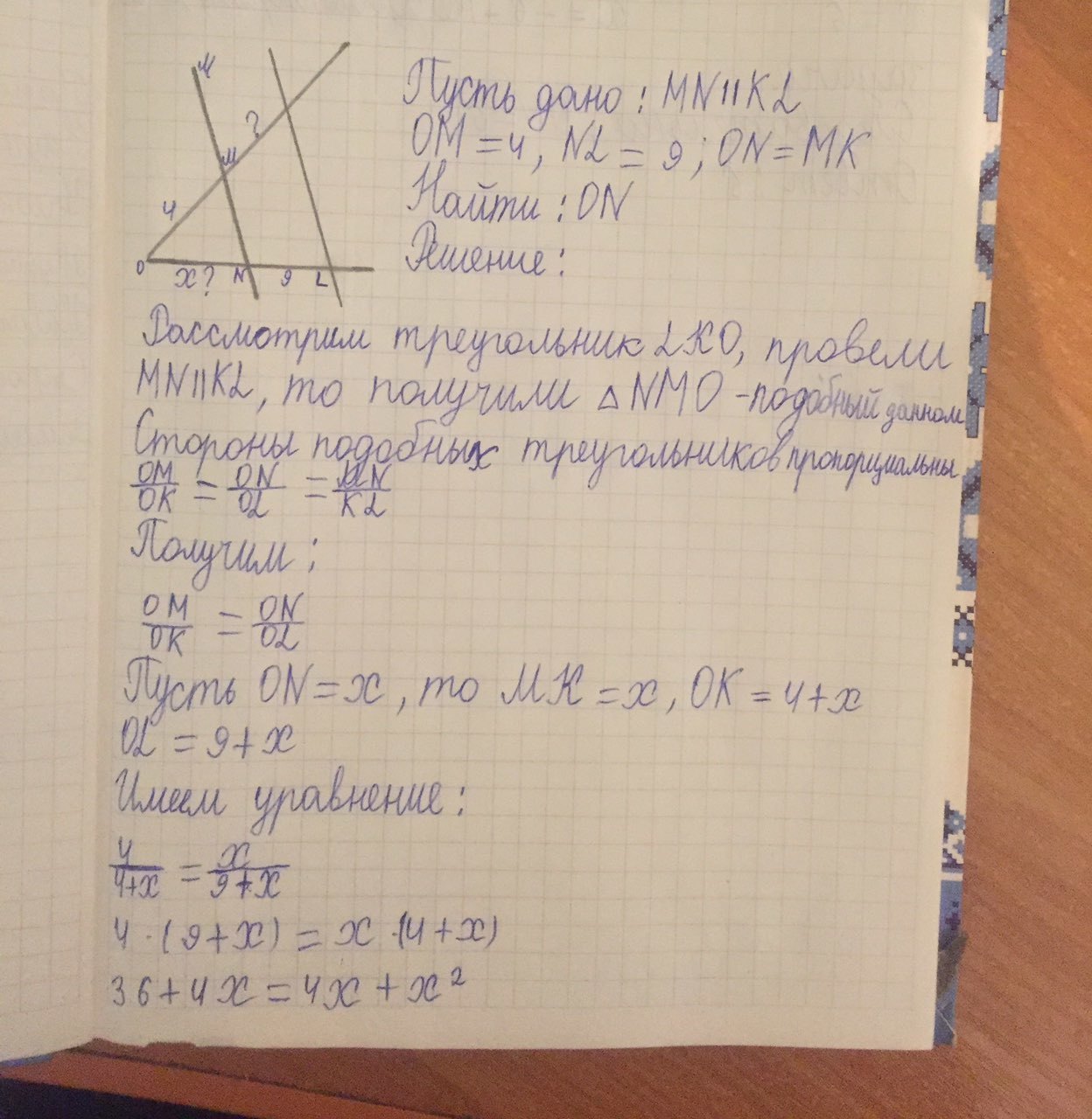 Параллельные прямые MN и KL пересекают стороны угла с вершиной O (рис. 169). OM = 4, NL = 9, ON = MK. Найдите длину отрезка ON
