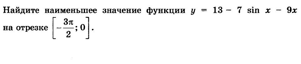 Найдите наименьшее значение функции y=13-7sinx-9x на отрезке [- 3П/2;0]