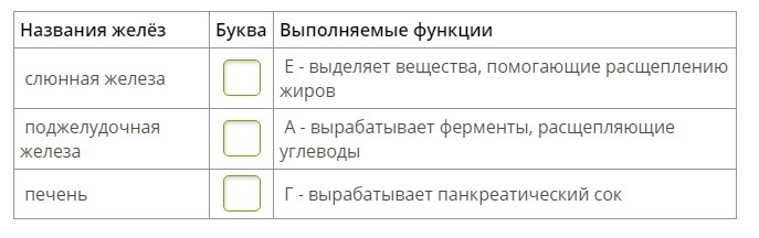 Запиши рядом с данными названиями желёз буквы, соответствующие выполняемым ими функциям: